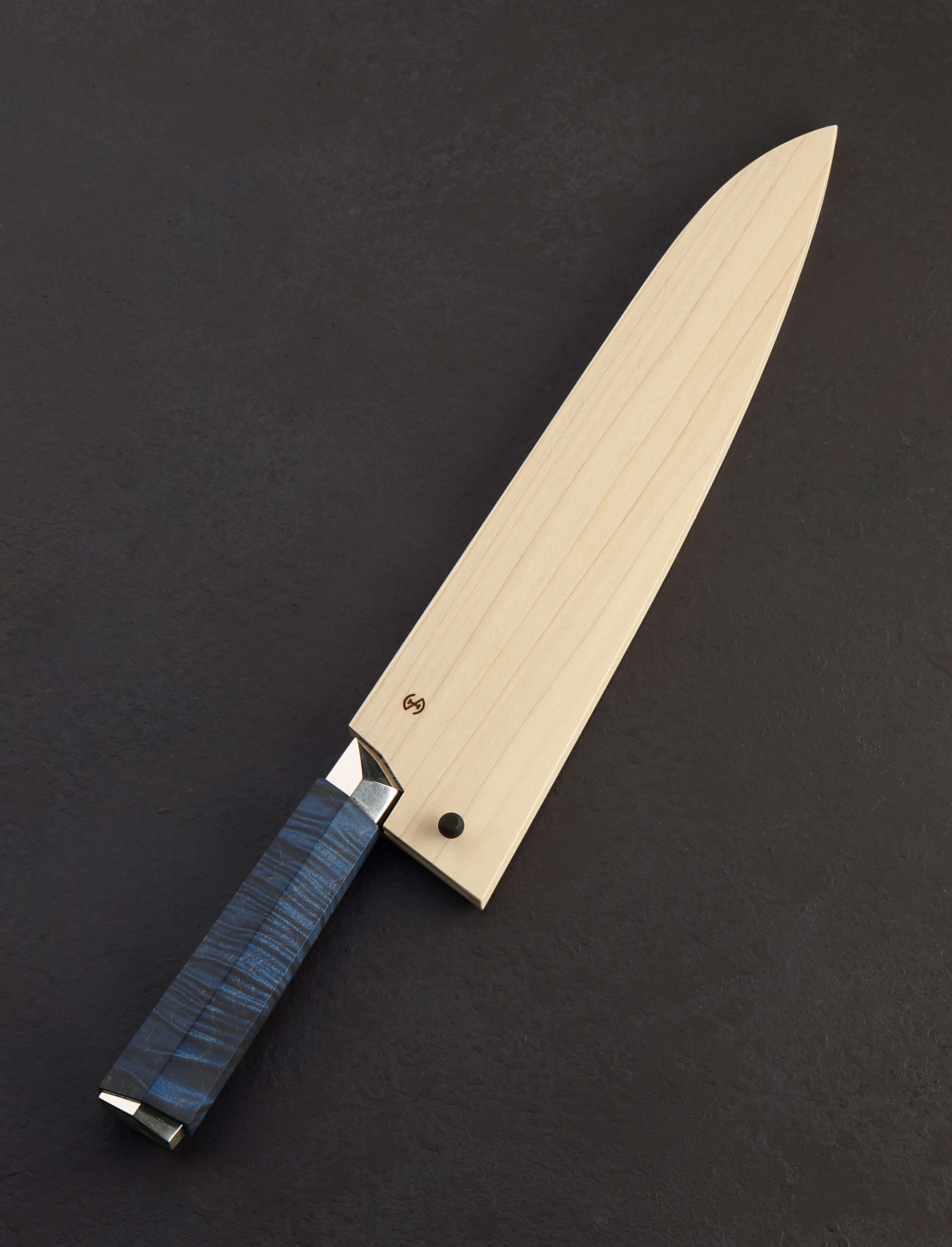 Beautifully calibrated and artistic touches are found at each point from tip to handle of this remarkable creation by maker Isaiah Schroeder. An object of art; a tool of the trade; a sculpture of the finest ingredients; a precisely engineered, functional heirloom. This one-of-a-kind gyuto crafted at Isaiah’s studio in Madison, Wisconsin satisfies every desire. It begins with the blade: forged by hand, the 245mm / 9.6″ long edge, bevels, and spine are shaped from Isaiah’s own house-made, 350-layer ladder pattern stainless damascus, a melding of AEB-L and 154 CPM high-performance stainless alloys. Making this material is a feat in and of itself, and Isaiah does it justice by endowing the 51mm tall blade with superb convex bevel geometry, a very thin, razor-sharp edge, a full distal taper along the rounded, polished spine, and a paper-thin, needle-like tip for slicing and detail work. The knife balances approximately 1cm in front of the blade’s heel, the expertly distributed 8.6oz / 244g of overall weight providing a nimble, natural, and solid feel in the hand. Designed to do it all in kitchens large or small, the blade is dynamic and versatile, stiff and sturdy in the rear for the most demanding cuts, with the spine taper and thoughtful geometry allowing for finesse and a slight touch of lateral flexibility in the final inches. But it’s not all business, either; to complement the striking visuals created by the stainless damascus is a handle that can easily stand on its own striking merits: faceted and polished for both comfort and style are front and rear collars of fine silver. Highlighting the silver at each end is a stunning piece of dyed and stabilized curly maple with eye-popping grain and a three dimensional-like chatoyance, sculpted in a traditional, tapering, hexagonal profile. The final touch, finished with incredible care and precision, is a two-tone mother-of-pearl inlay in flower formation set in maple at the rear of the handle’s silver collar. A handmade poplar saya is included.