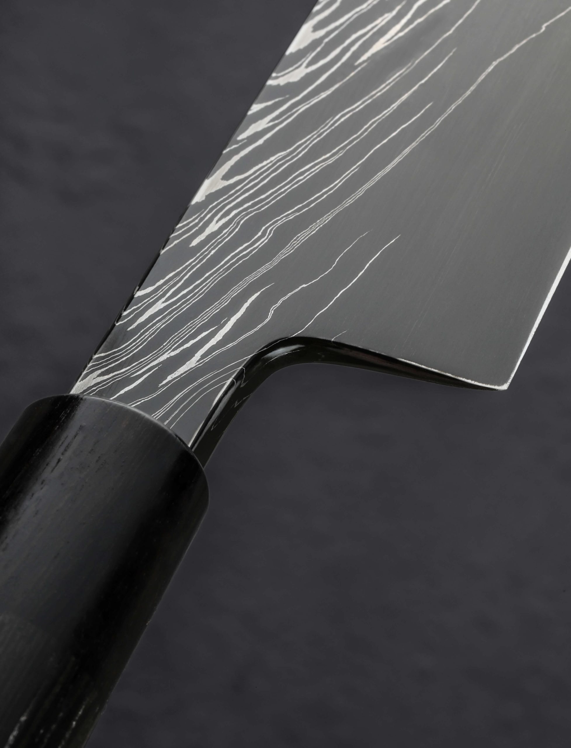 The blade is hand-forged from Joseph Schrum’s striking and unique Silver Smoke pattern damascus, while the dark, elegant handle is sculpted from a combination of African Blackwood and Ukrainian Bog Oak. Joseph, the independent artist behind Missouri’s Halcyon Forge has created yet another superb tool that balances form and function in impressive ways. With a dark etch that conjures wisps of shimmering smoke curling over a nighttime scene lit only by the light of the moon, the steel is as versatile on the cutting board as it is inspiring to the mind. At 274mm / 10.8″ long with symmetrical, convex bevel geometry and a thin, razor-sharp edge, the blade is designed for all manner of precision slicing, whether proteins, from delicate sashimi preparation to careful, measured cuts of wagyu, or scoring and detailed cuts of vegetables large and small. Full-convex geometry and a wide, rounded blade spine out of the handle offer strength and rigidity throughout the blade’s length, while a full-distal taper down said spine provides a dynamic finished product with an extremely fine, pointed tip. With fingers wrapped around a simple, oval, wonderfully finished hidden-tang wa-style handle, the balance and weight of this stunning object leave nothing to want.