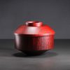 An ancient word meaning ‘elegantly hanging’, the term Shinafu inspires the Sinafu collection of lacquerware, designed by Kenichiro Oomori for Gato Mikio. Turned by hand in the region around Yamanaka, famed for its woodwork, using both modern techniques and traditional woodturning methods which date to the time that Nara was the capital of Japan in the 700’s, each Sinafu serving bowl is meticulously formed. As its namesake suggests, Sinafu’s designs are meant not only to express warm hospitality but to also quite literally make the movement of the hands appear more graceful, more elegant. Employing the tatekidori style of woodturning that uses cross-cut wood, in this case keyaki zelkova, a Japanese hardwood often used in the art of bonsai, the object can be turned with great precision resulting in an bowl of extraordinary quality; a long-lasting tool which will resist distortion over time and display the material’s natural grain beautifully. Soft and light to the touch, the skill of the Gato Mikio craftspeople is extraordinary. These exquisite bowls with black stain and transparent lacquer finish adorn the home with grace beyond the expected.