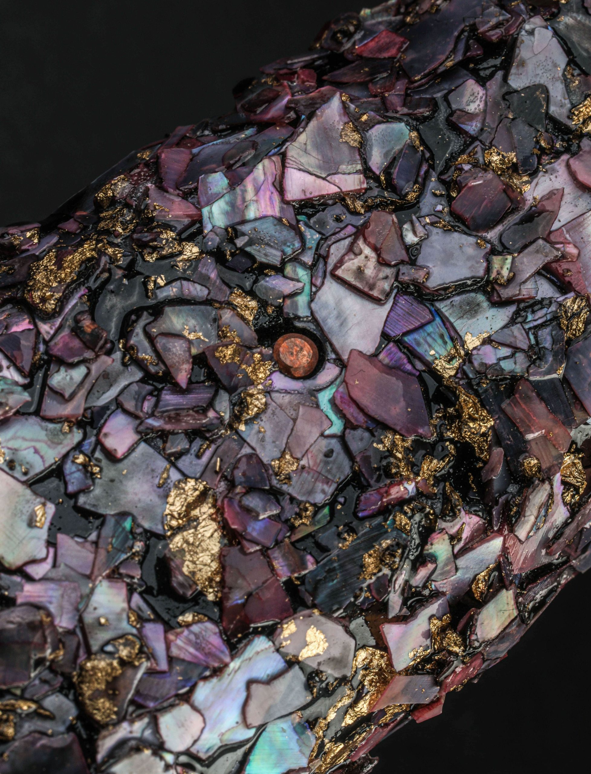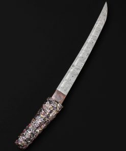 Australian artist James Oatley’s contribution to The Art of Cutlery, a knife named “Siren,” on show during summer 2024 in Tribeca, NYC, combines elegance in form with boldness and beauty of being, to sing the song of the Siren to all who venture near. Shaped from small-batch stainless damascus steel in classic Japanese tanto form designed for slicing and serving in the dining room, the blade bares James’s meticulous geometry including a concave fuller along the spine. A traditional, copper habaki wraps the base of the blade. The handle, and matching saya, when together, form a seamless seascape, each encrusted with crushed abalone shell and gold flake. Siren is presented on a wooden stand. This knife is razor-sharp and crafted for culinary use.