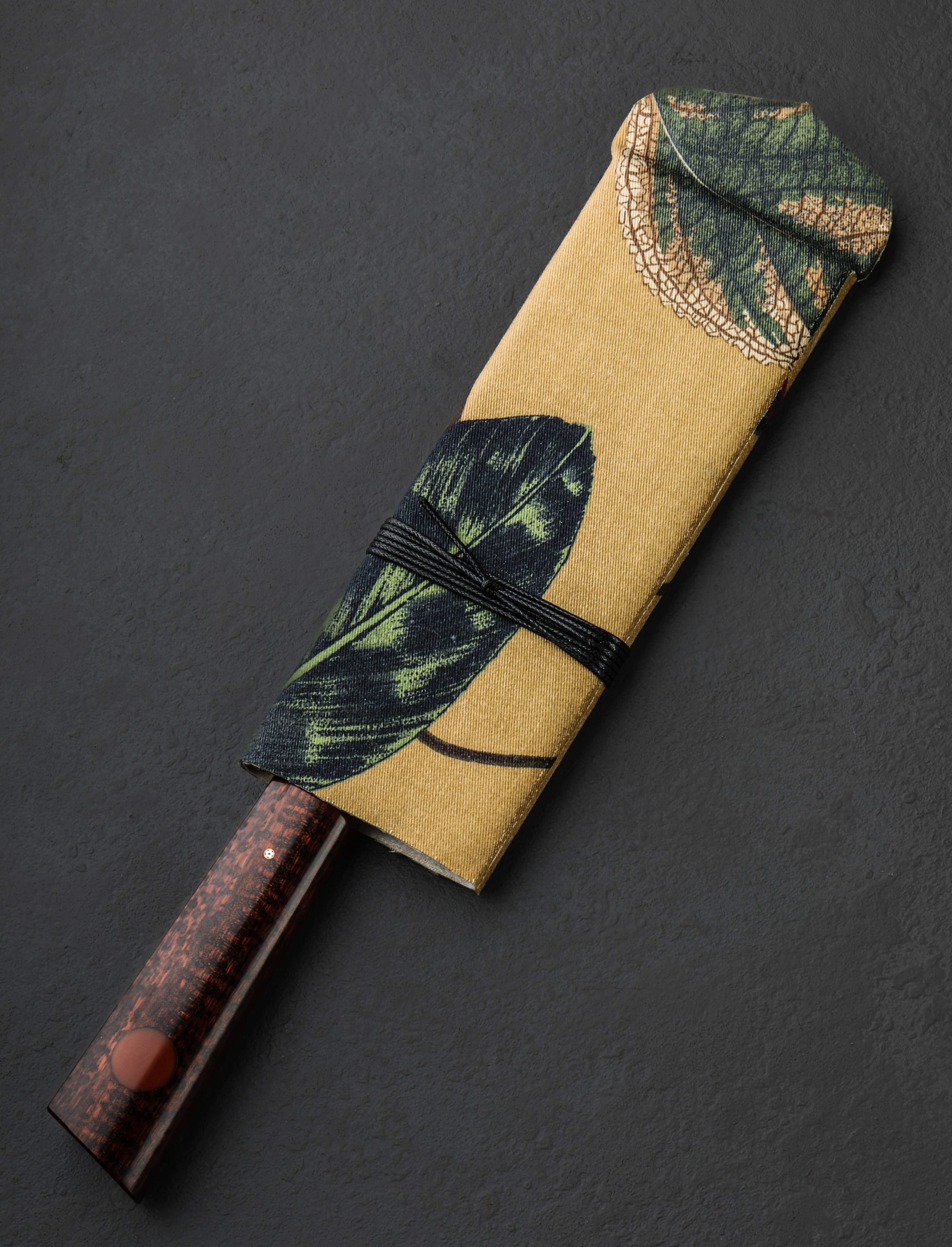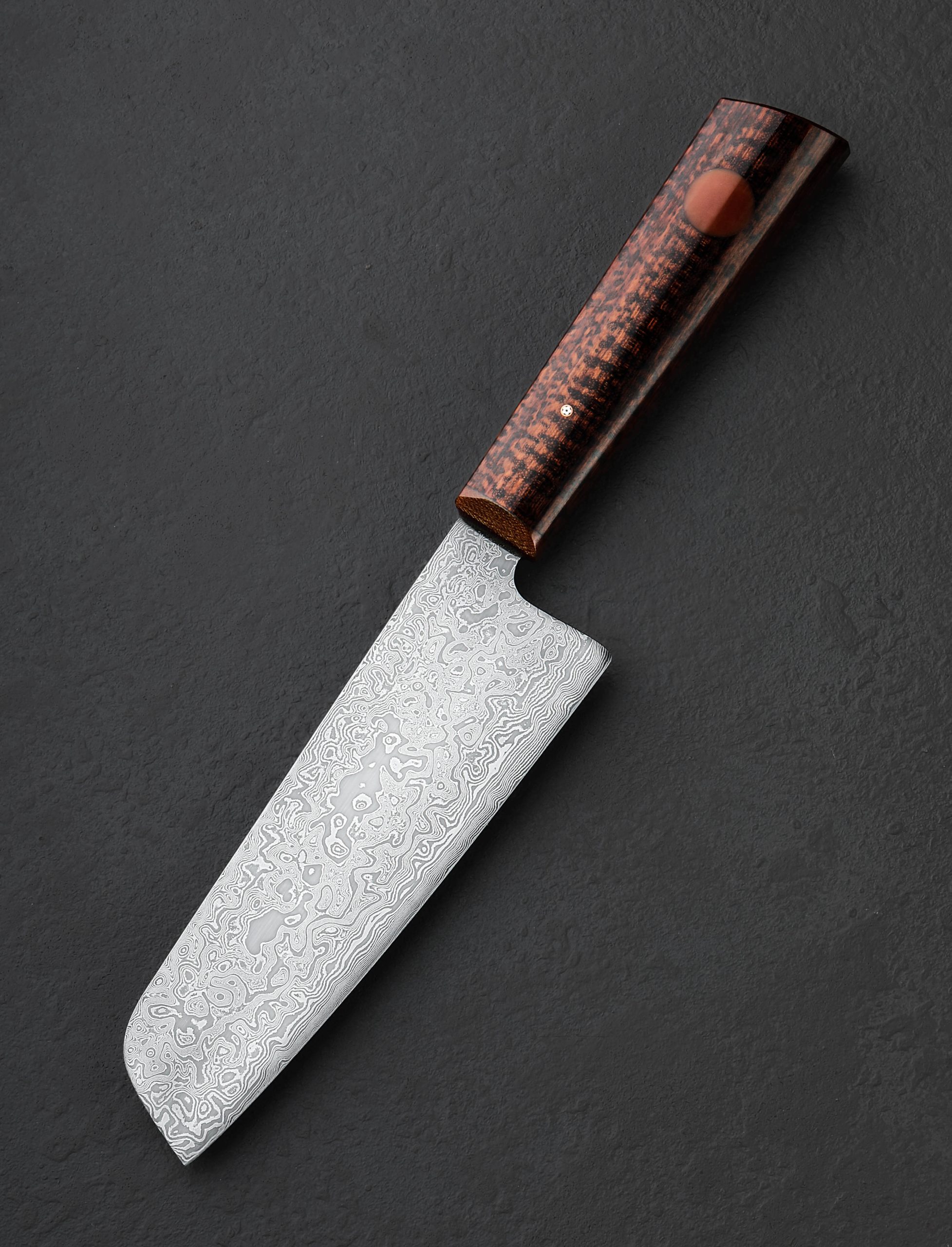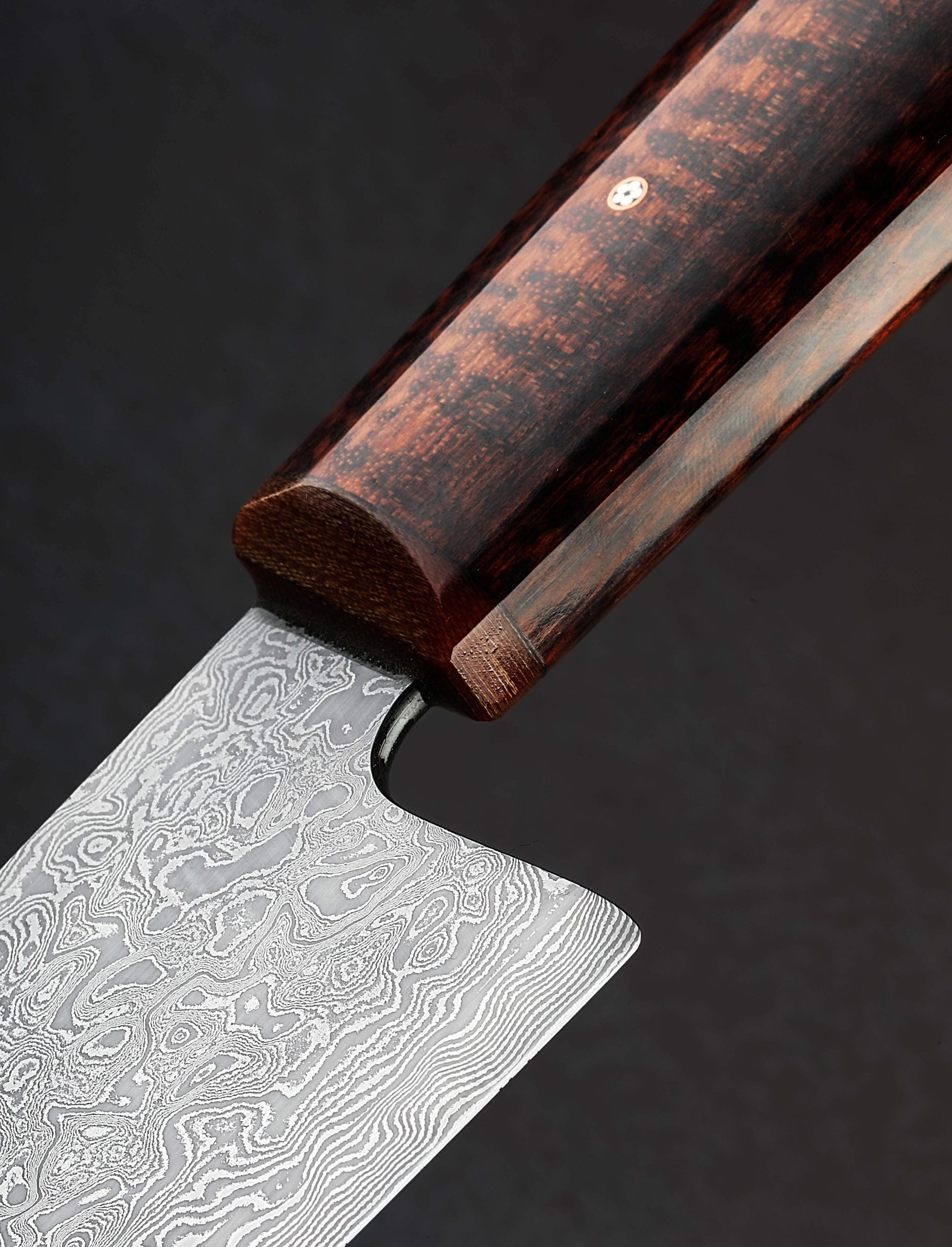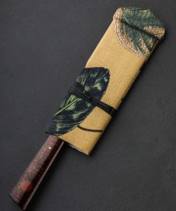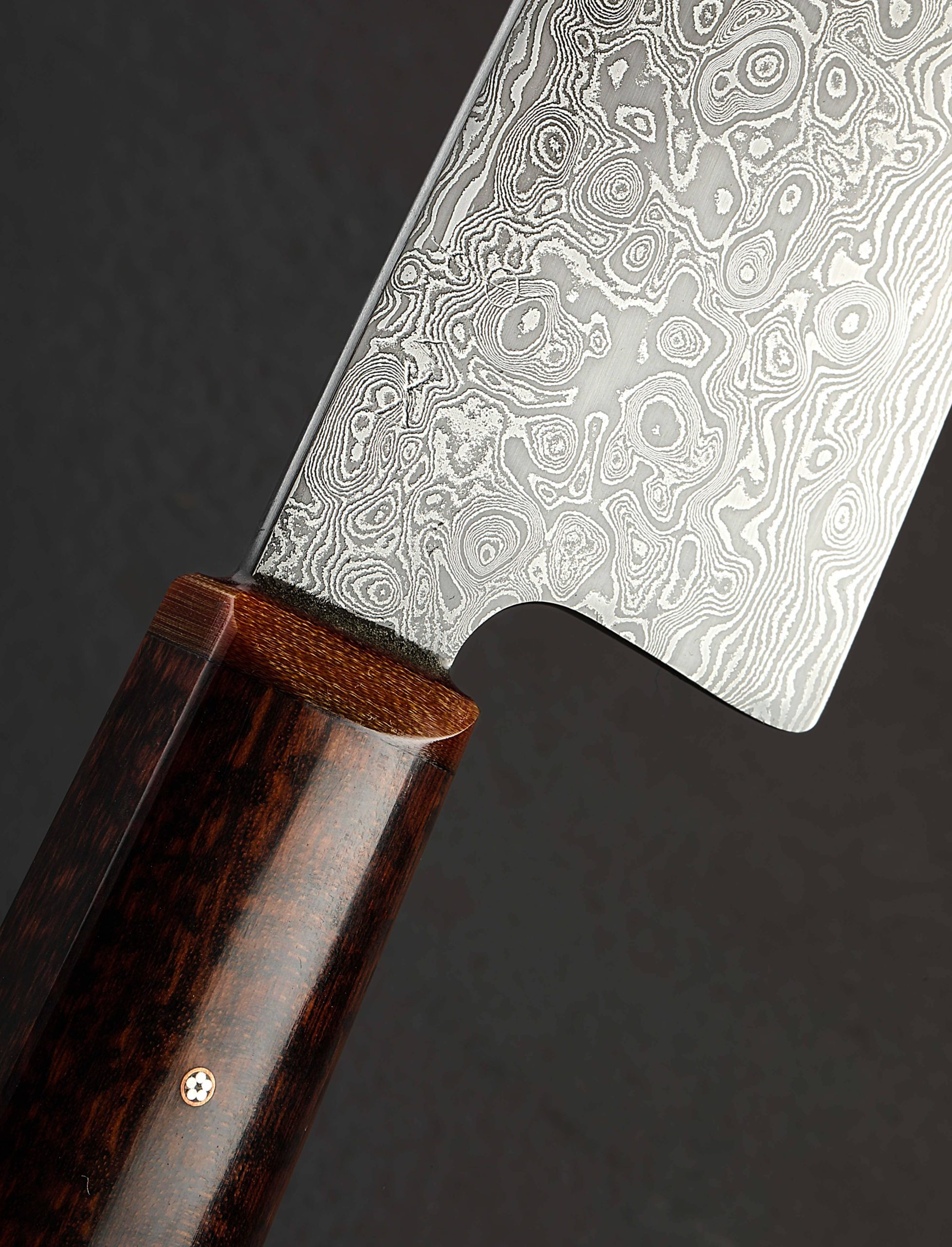 In a single, edged chef’s tool the extensive experience and unyielding pursuit of excellence of two of our talented and longest-standing makers is on full display. Forged to shape by ex-chef and California bladesmith Don Carlos Andrade comes a presentation-grade vegetable cleaver in carbon damascus steel created by artisan and Washington designer Salem Straub. Etched and polished to reveal the beautiful, randomized pattern of alternating 15n20 and 1084 alloys which Salem has so elegantly provided his counterpart, the blade’s material is classic, refined, and designed to perform. Taken to the anvil, Don’s repetitive hammer blows move metal with heat and pressure to create a 175mm / 6.9″ long by 57mm tall cleaver-inspired profile with efficient vegetable chopping squarely in its crosshairs. Unlike some, this blade is not paper thin and delicate, but robust and ready for everything, boasting Don’s superb and pronounced symmetrical convex primary bevel geometry which leads downward from rounded spine to an especially thin, razor-sharp edge. The hard, toothy, carbon damascus edge paired with Don’s meticulous shaping and balancing of the steel combine for an extraordinary cutting experience. The knife’s center of gravity falls just as handle meets metal, providing the chef a comfortable, natural, and steady feel on the board, with a total mass that allows the object’s weight to do its portion of the work. As with all work by one or both of these incredible West Coast craftspeople, art, tool, heirloom object, and living artifact are each, at once, the result of their creative visions, culminating in this one-of-a-kind piece with a handle as breathtaking as the blade. Sculpted in Don’s well loved, shield style wa handle shape is a stunning piece of snakewood, inlaid as is his trademark with round, maroon G10, capped at the front with a matching G7 glass laminate, and finished with a single mosaic pin. To protect and transport the Snakewood Damascus Cleaver, a cloth-covered saya is included.