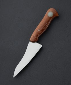 Designed for shallots, and built to do far more, a new and unique rendition of the Shallot Knife by Don Carlos Andrade of California is fresh off the work bench. Shaped from 52100 carbon steel, this compact, multi-function utility blade can chop, slice, filet, and perform detail work with the best of them, the 140mm / 5.5″ razor-sharp edge honed for cutting performance in professional and home kitchens alike. Don utilizes the pronounced convex geometry he is known for in this blade, pairing it with a rounded, polished spine that tapers steadily to a fine, needle-like tip, to offer both toughness for demanding cuts and dense ingredients, and the precision required for carving and slicing. Don’s silky, satin, hand-sanded finish graces the strong, versatile bevels for a sophisticated aesthetic and friction-free surface. A comfortable, hand-hugging Western handle is carved from vintage Westinghouse canvas micarta, finished with a single hand-hammered stainless steel pin and Don’s signature circular inlay of translucent green G10. This one-of-a-kind tool includes a custom, cloth covered saya.
