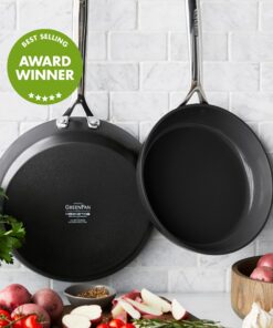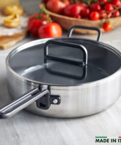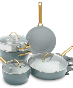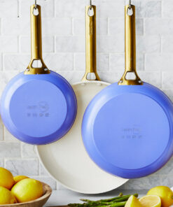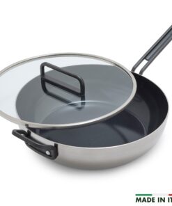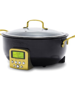 Made in Italy at GreenPan’s high-tech facility, this Dutch oven is inspired by a vintage Italian pot Stanley received from his mother. The cast solid handles are simple and functional while the angled walls eliminate tight corners and promote better stirring. The cast aluminum lid and heavy-duty body heat quickly and evenly.
