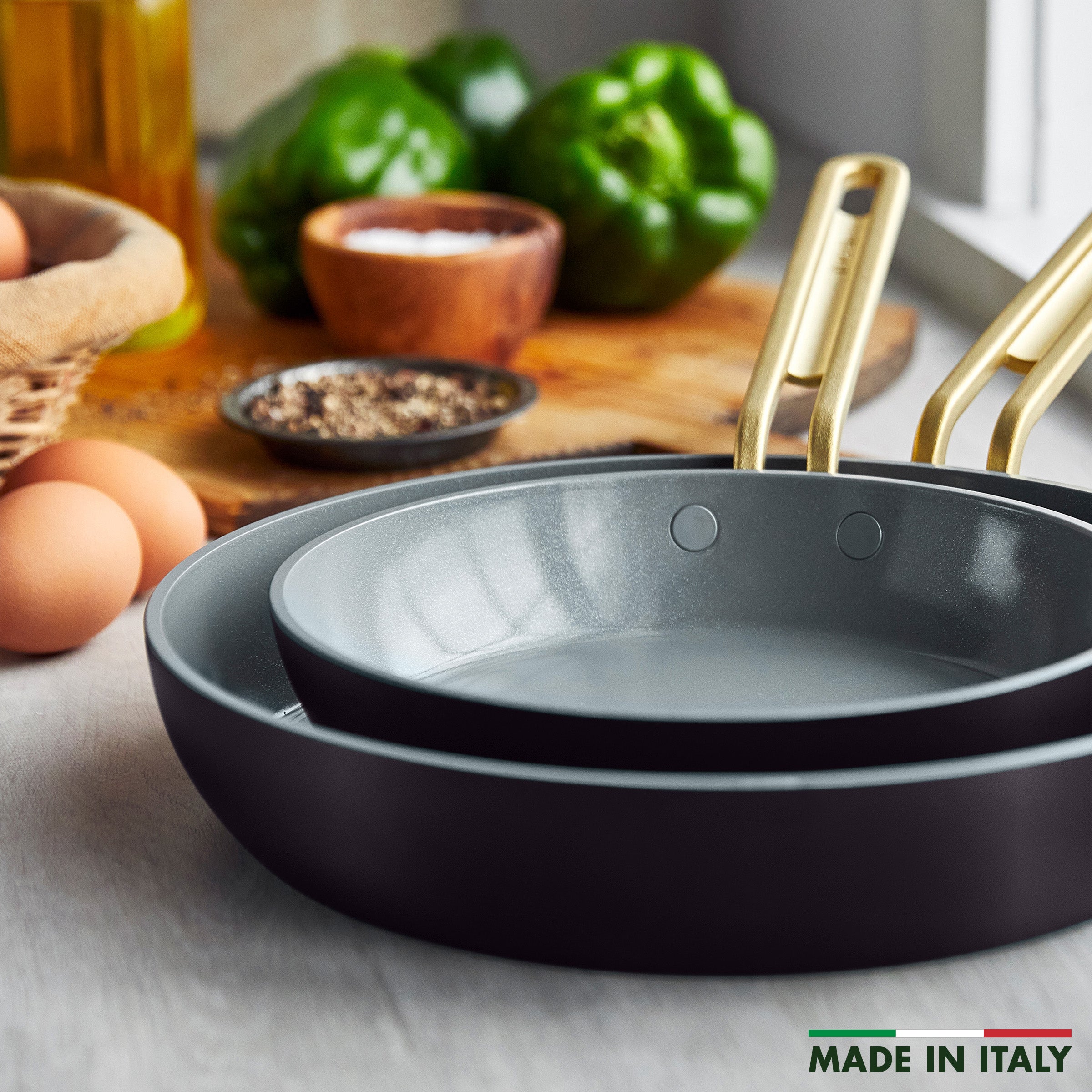 Packed with cutting-edge details, this frypan set from the collection brings high-tech cooking to any kitchen. Made in Italy, these pans feature heavy-gauge 5mm bodies with a cutting-edge Plasma Tech treatment that complements our groundbreaking Infinite8 coating for remarkable PFAS-free performance.