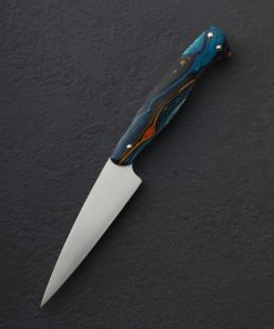 In an elegant and unique paring knife profile that Don Carlos Andrade produces only rarely comes a tool designed for versatility and suited especially well to handheld work above the board as well as detailed slicing work with its slim, aggressive tip. Inspired by Vincent Van Gogh’s iconic work, this one-of-a-kind parer boasts a sculpted, Western style, full-tang handle in G.L. Hansen & Son’s handmade Starry Night G-Carta. Layers of carefully laid fabrics are compressed under high pressure with resin to form the stunning material which Don secures with three domed, hand-peened stainless steel pins. At the business end of the knife is 100mm of razor-sharp, satin-finished RWL 34 stainless steel, a high-performance alloy produced in small batches by specialty Swedish steel maker Damasteel. Tapering along the rounded, polished spine to an especially fine, pointed tip, the hard-working blade enjoys Don’s superb convex geometry above a sharp, thin edge.