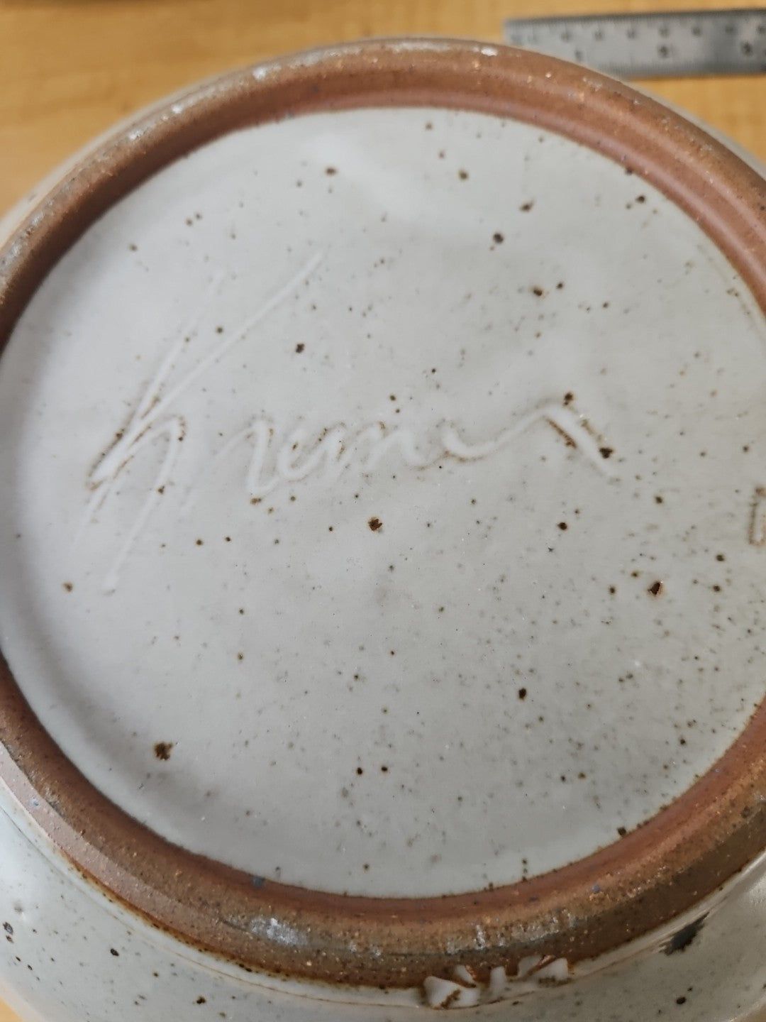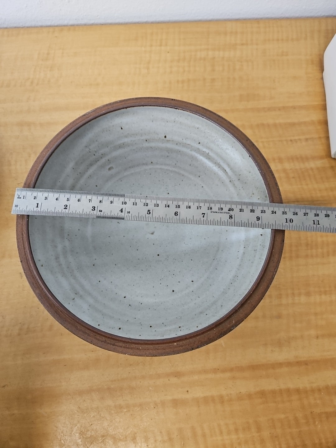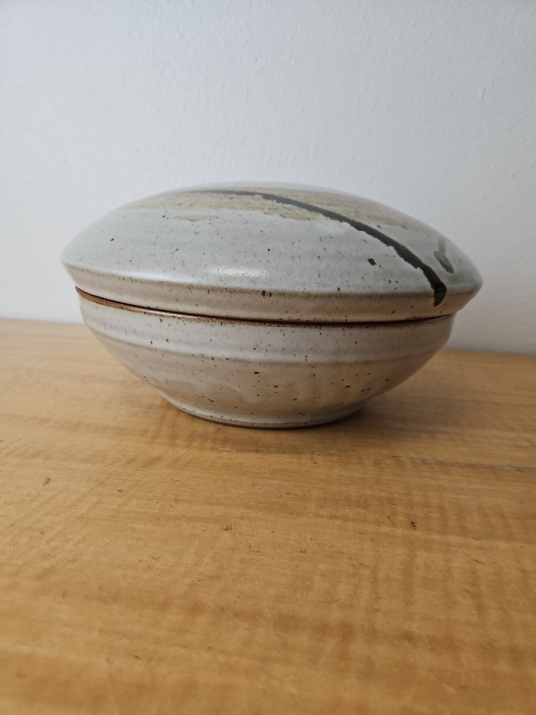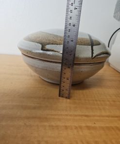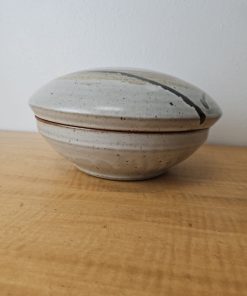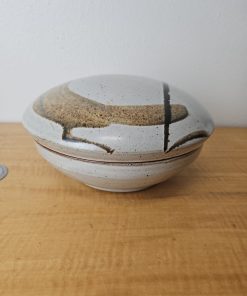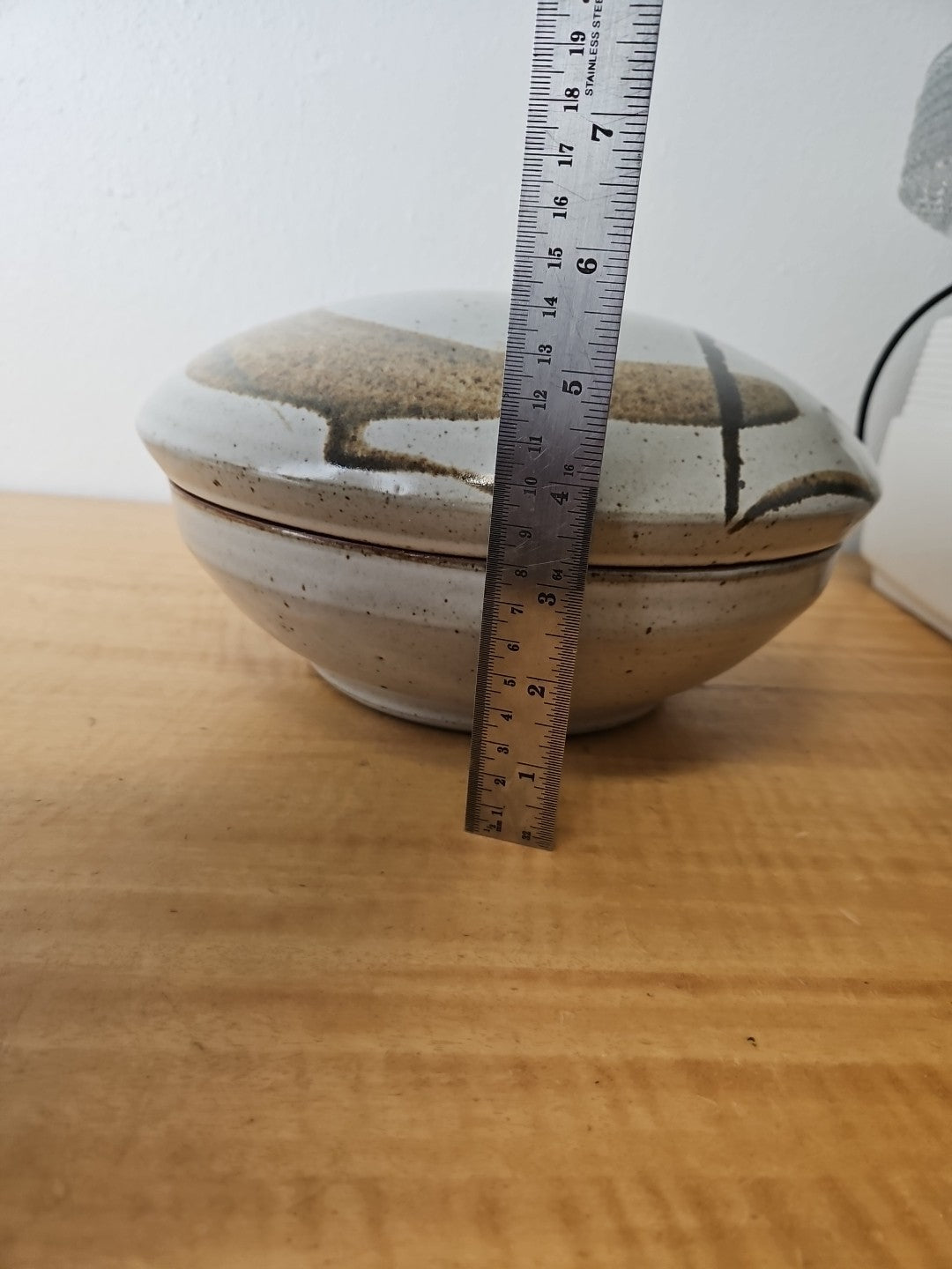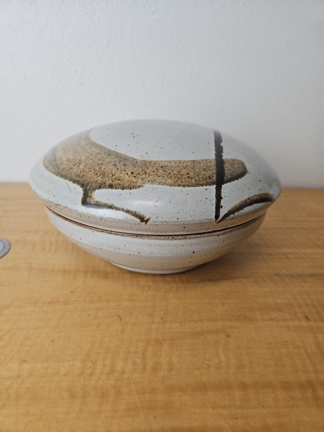 Stoneware lidded bowl or dish 10″, signed and stamped