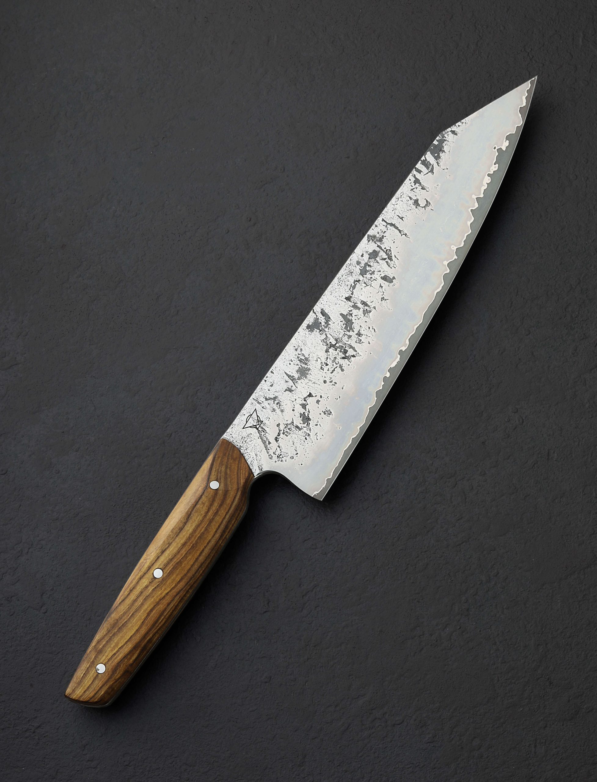 Boasting well over a decade of metalworking and bladesmithing experience, not to mention a masters degree in metallurgy and the right to claim co-inventor of the high-performance steel alloy used in this very blade, artisan Tobias Hangler’s chef’s knives check all the boxes. Forged at his studio outside of Graz, Austria, Tobias has fashioned this beautiful, 224mm / 8.8″ blade from ApexUltra carbon steel clad in stainless steel, the two materials separated by a vein of pure nickel to inhibit carbon diffusion during forging and hardening. Large and powerful in the hand, the blade stands 56mm tall at the rounded, polished choil, delivering ample belly in the Japanese-inspired profile for big cutting jobs, toughness along the thin, hard edge for precision and versatility, and a very fine, needle-like tip for detail work and slicing. Balancing an inch in front of the heel, below a wide, tapering, polished spine and forged-finished flats that show the origins of the blade’s hand-hammered origins, the knife is weighted, powerful, and still nimble in the hand. For comfort and control at the cutting board Tobias sculpts striking sumac wood, secured by three flush, stainless pins to form a simple, elegant, all-business handle that suits a variety of hands and cutting styles. A one-of-a-kind workhorse for the hard-working chef’s kitchen.