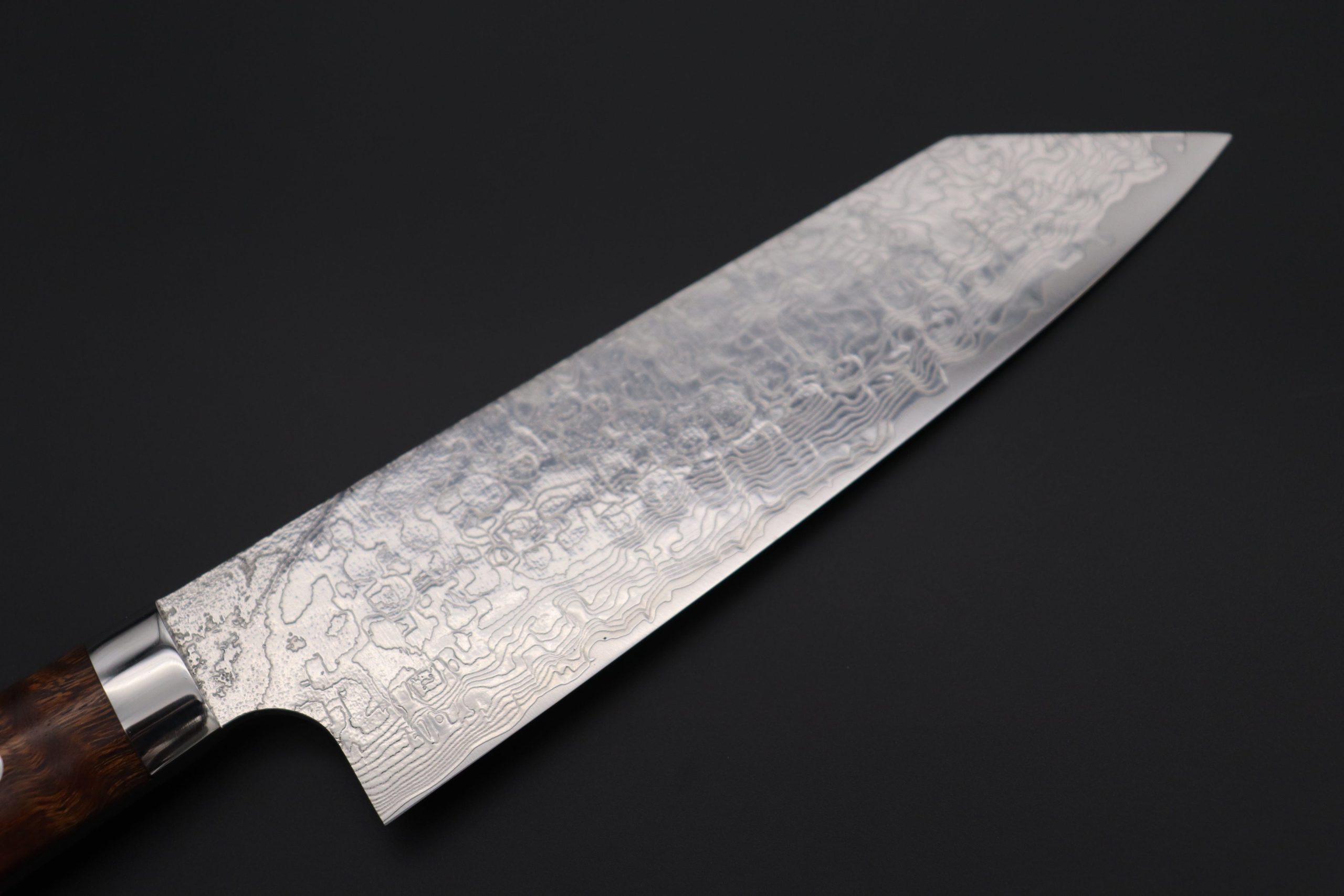 After testing and evaluating a very reputable Powdered Metallurgy High Speed Tool Steel, called “R-2” (Manufactured by Kobelco), he decided to produce an exciting new range of this traditionally hammer-forged Damascus kitchen knife using this modern ‘super steel’.