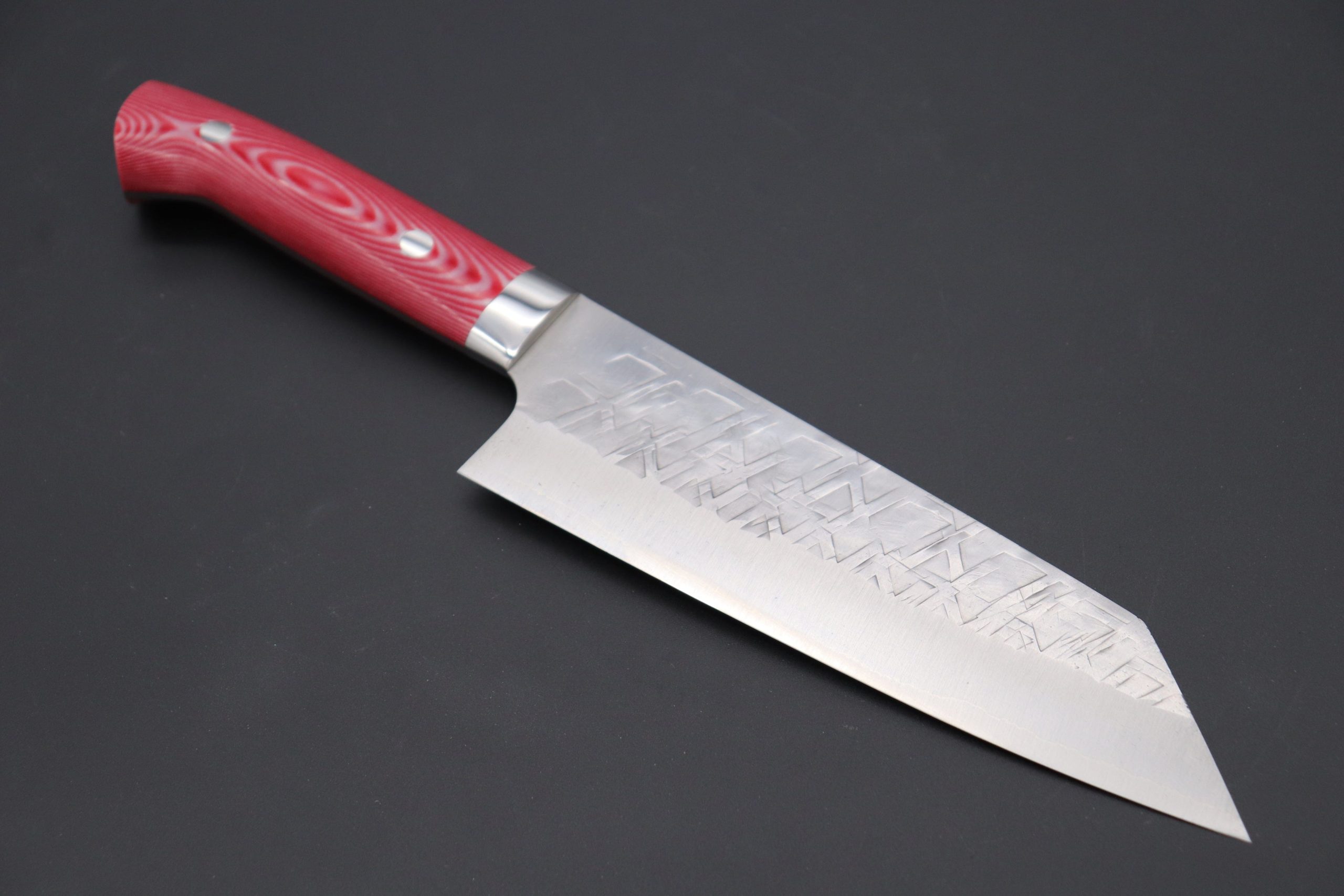 The attractive shiny SRS-13 blade core of these knives contrasts strongly against the textured, soft stainless steel outer cladding layers. The hand-contoured Red&White Linen Micarta Handle provides a secure grip and extra durability. Unlike the bland machine-produced handles of regular Western-style knives, when we grip the handles of Takeshi Saji’s knives, we can feel the warmth of the craftsman’s vision for his entire handle making process – They are truly something special to own, hold and use. The custom handcrafted handles perfectly match his handcrafted, Traditional hammer forged blades, which have much more ‘soul”. Master Saji’s knives are also fitted with a polished stainless steel bolster for improved handle durability and blade balance. So, taken as a complete package, these knives are not only visually striking, they are also highly practical and easy to care for.
