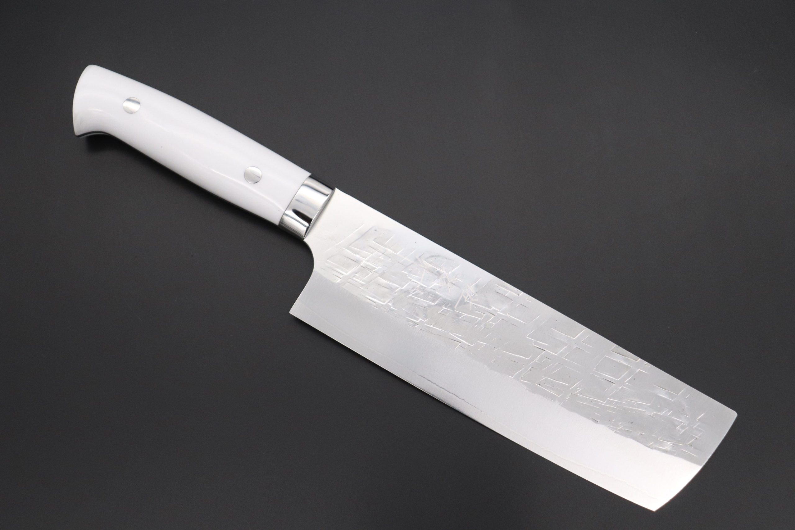 The attractive shiny SRS-13 blade core of these knives contrasts strongly against the textured, soft stainless steel outer cladding layers. The hand-contoured White Corian Handle provides a secure grip and extra durability. Unlike the bland machine-produced handles of regular Western-style knives, when we grip the handles of Takeshi Saji’s knives, we can feel the warmth of the craftsman’s vision for his entire handle making process – They are truly something special to own, hold and use. The custom handcrafted handles perfectly match his handcrafted, Traditional hammer forged blades, which have much more ‘soul”. Master Saji’s knives are also fitted with a polished stainless steel bolster for improved handle durability and blade balance. So, taken as a complete package, these knives are not only visually striking, they are also highly practical and easy to care for.