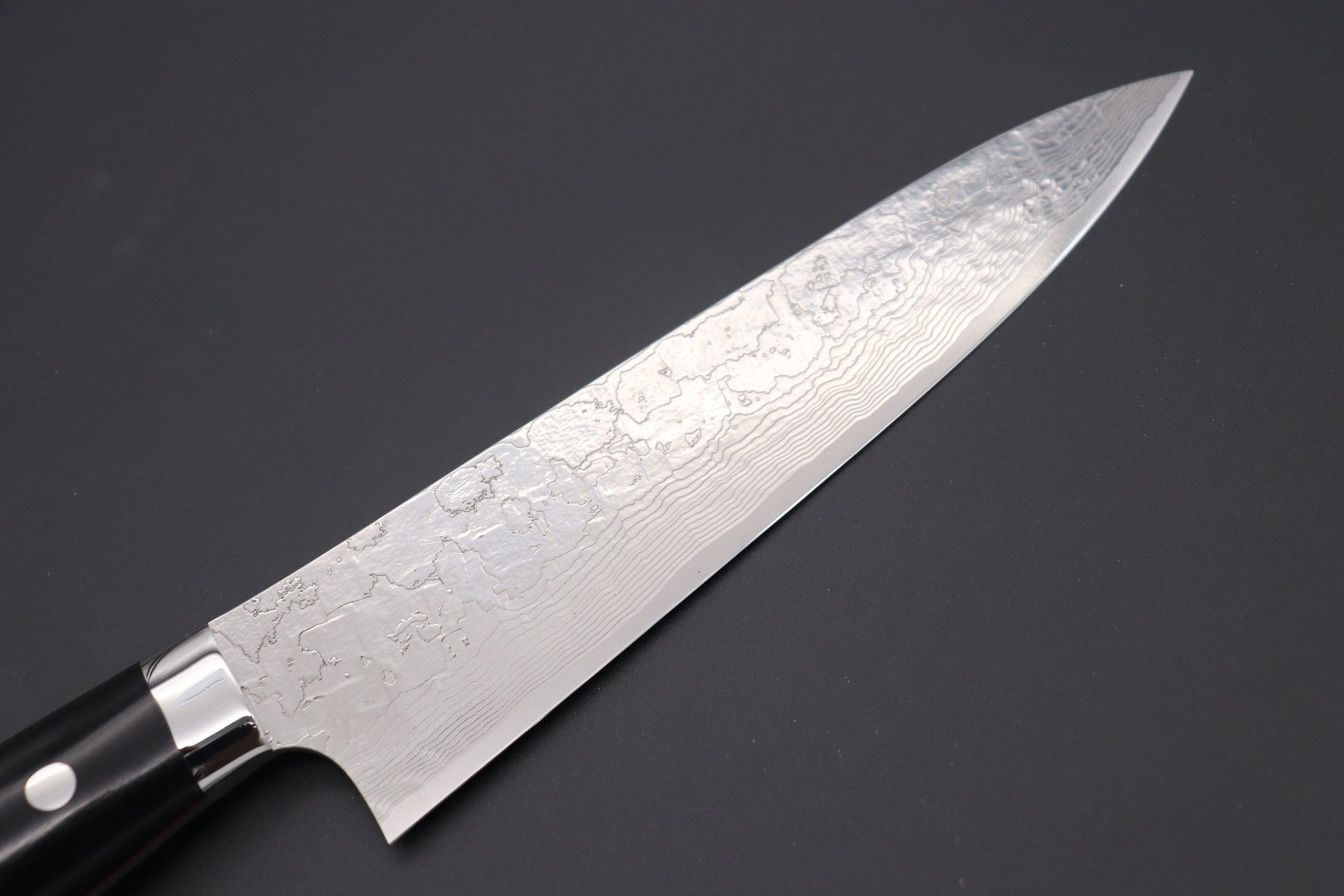 Mirror Polished R-2 Damascus blade, which features unique ‘random Damascus’ pattern, which Master Saji calls “Diamond Damascus”. It is handcrafted using a complex series of forging processes and undergoes a specially formulated acid etching and polishing process. When combined, these techniques produce a unique Damascus blade, which has an uneven surface texture that sparkles beautifully, like a cluster of cut diamonds.