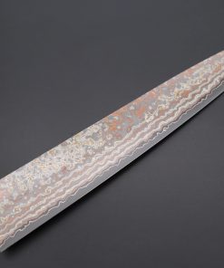The blade is made with a VG-10 core forged Nickel Damascus Stainless steel (HRc. 62) and features a traditional Japanese Hamaguri-Ba (Convex) blade grind that provides remarkable cutting performance.