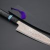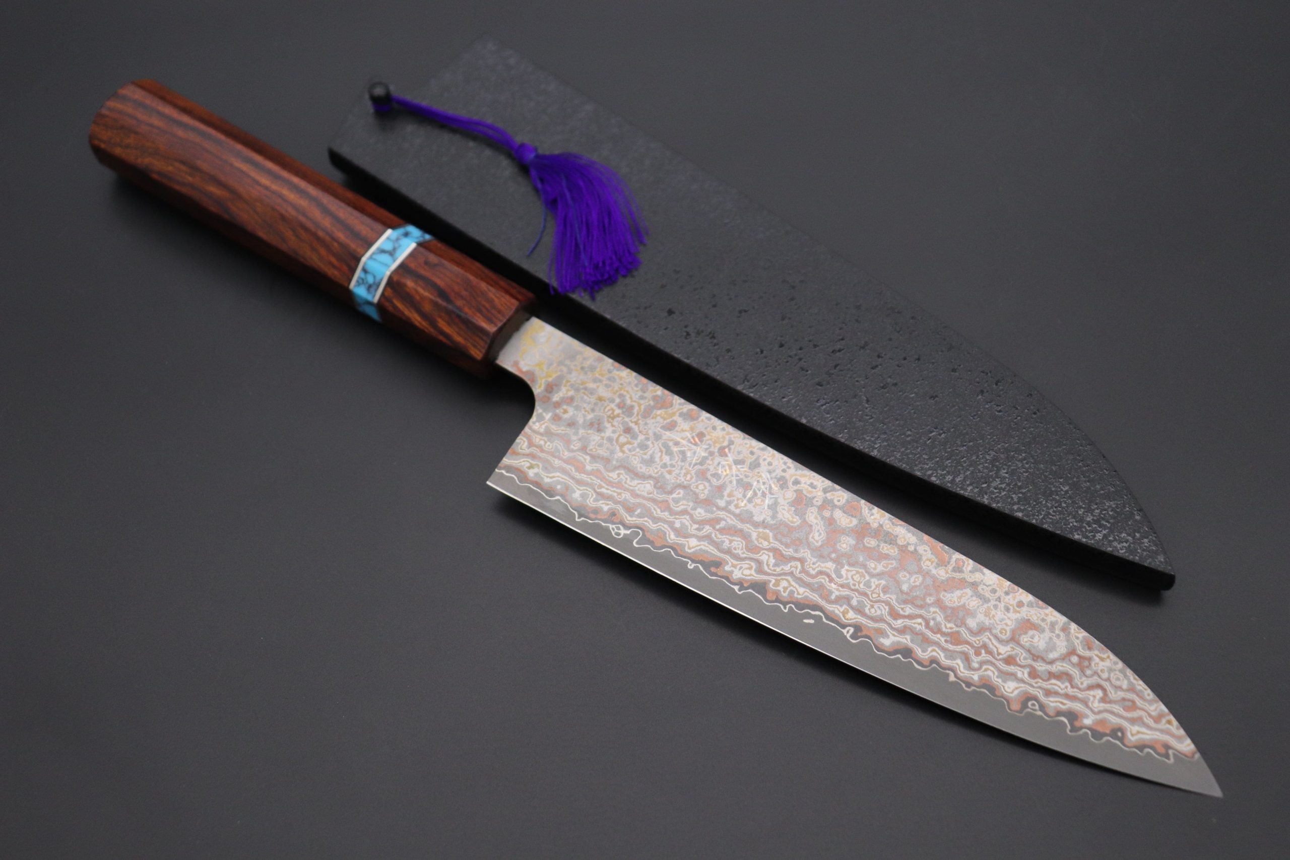 Master Saji has just completed a fresh new batch of traditional hammer forged custom kitchen knives that, once again, feature his unique multi-colored Damascus. The blades have a core of VG-10W Cobalt-Tungsten Stainless steel (HR.c 61 to 62), which has been clad with multiple layers of rust-resistant stainless steel, brass and copper.