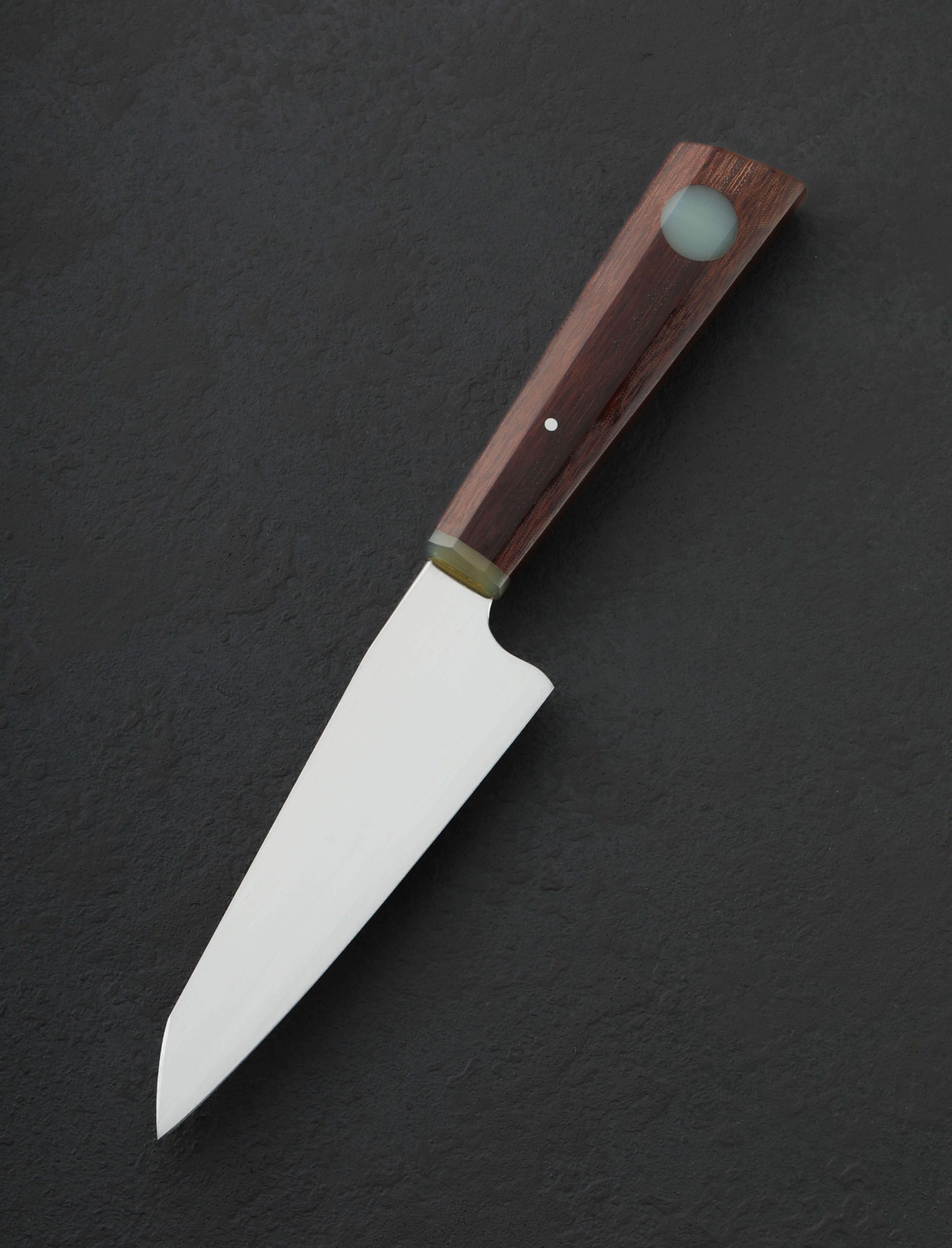 A special Don Carlos Andrade creation for the chef’s kitchen in time for the giving season (but we won’t tell if you keep it for yourself). In Don’s long-admired EDK, or Every Day Kitchen profile, the blade is shaped from 52100 carbon steel, the 145mm / 5.7″ long by 42mm high form packing big, versatile utility in a compact package designed to perform every cut from the most demanding to the most delicate. Tall enough to rock on the board and precise enough for detailed work with the low, pointed tip and sharp edge, the blade boasts Don’s always-superb convex geometry, pronounced and meticulously finished for food release and overall cutting performance, paired with a full-distal taper from a strong, tough heel to a slim tip. The bevels’ silky, satin-finished faces are matched with a unique design element at the spine: an asymmetrical ‘clip’ that merges in the final inch with a nicely detailed, three-face faceted stretch that drops downward to the tip itself. Further adding to the allure of this outstanding, one-of-a-kind build is a handle in Don’s shield-profile wa handle design shaped from the rare, vintage Triple Weave Westinghouse micarta, accented with Don’s trademark round inlay in translucent green G10 and matching ferrule. Striking details abound in the shaping and finishing of this grip offer comfort, control, and exceptionally good looks. A custom cloth-covered saya is included.