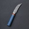 In a tool built for cutting performance first and foremost, an undercurrent of artful, refined elegance permeates each element of this one-of-a-kind chef knife forged by Jordan LaMothe. Practicing his craft in Upstate New York, the ABS Master Bladesmith held nothing back in the creation of this first tool built exclusively for our online collection…Jordan did however contribute a knife named Rift to , a group exhibition which we curated in NYC in 2024, the first knife at that event to find a buyer. Like Rift, this work of culinary art has been forged by hand from an exceptional, homemade damascus pattern, named as you may have guessed, Undercurrent. The bold, flowing marriage of carbon steel alloys extends from the integral handle bolster forward to the tip, forming a striking, 265mm / 10.4″ blade. With the popularity of ‘feathered’ damascus steel patterns today this blade could appear at first glance to present its own play on the feathering technique, however that is not the case: Jordan has instead designed and forged a pattern that when cut, stacked, and aligned just so into the final mosaic, and then carefully stretched through repeated hammer blows via the blade profile’s formation, appears to mimic the oft-seen approach but using very different methods. When the blade hits the board, it is every bit as performative and hard-working as it is beautiful. Jordan’s symmetrical bevel geometry is superb from tip to heel, offering full-convexity that slims from the spine downward, culminating at a razor-sharp, near zero-edge, with only a slight secondary bevel being present. The rounded blade spine tapers steadily, providing strength and toughness in the rear nearest the 55mm-tall heel, and a thin, aggressive tip at the end of the K-tip profile, just behind which Jordan balances precision with enough material for demanding work and durability. These attributes combine with a finely tuned heat treatment to produce a hard blade with a touch of lateral flexibility in the front half. Completing the handle that is as comfortable to hold as any we have had the honor of experiencing, Jordan matches to the rounded, integral bolster of Undercurrent damascus two rings of polished sterling silver which bookend a piece of Arizona Dessert Ironwood, followed by a beautifully sculpted piece of Indian Rosewood. Finally, a decorative, polished stainless steel inlay is found at the handle’s rear face.