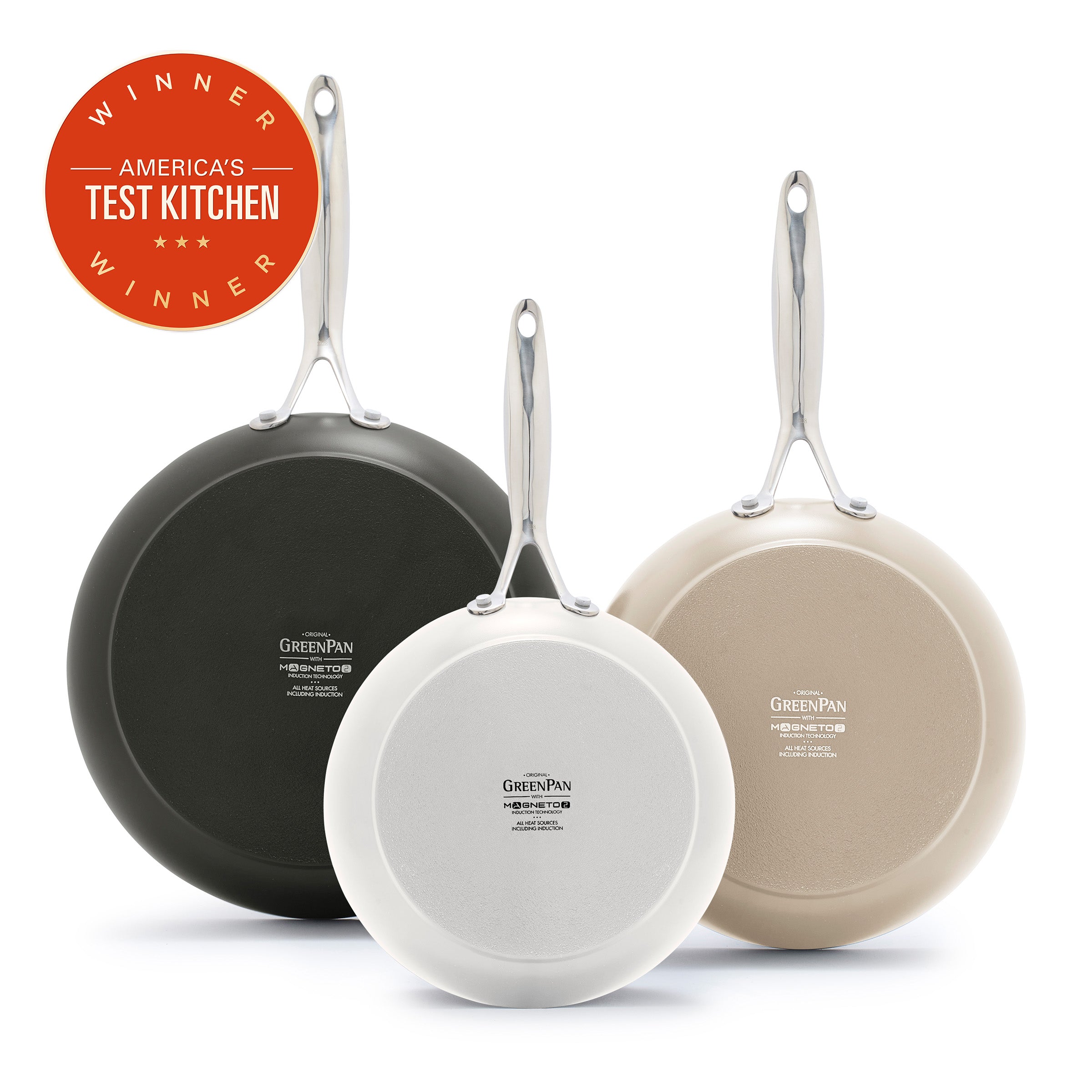 Add versatility and vibrance to your routine with this must-have frypan trio. Crafted from hard anodized aluminum for daily durability, these pans are ready to conquer every meal – large or small. Experience professional results on any stovetop and then clean up without worry.