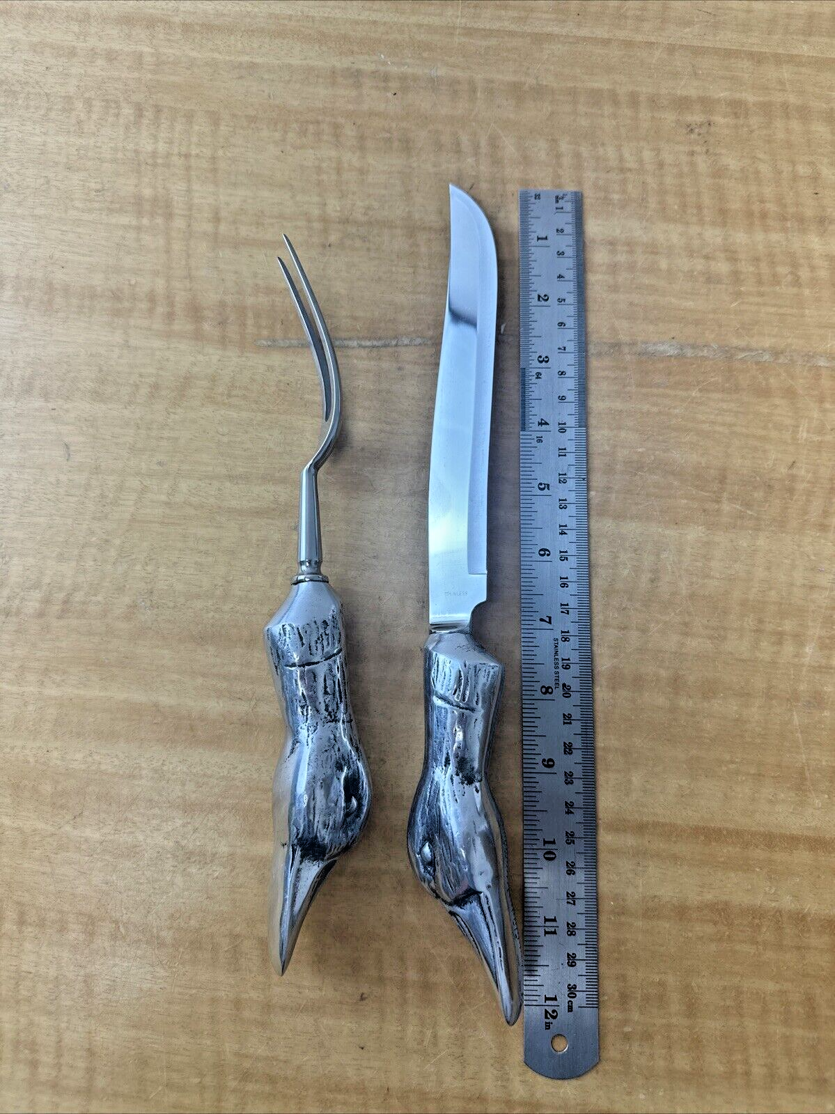 Vintage 2 Piece Carving Set Knife & Fork RWP Wilton Pewter Duck Head Handles