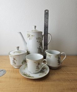 set includes pot with lid, creamer, sugar bowl with lid, 6 cups, 6 saucers.