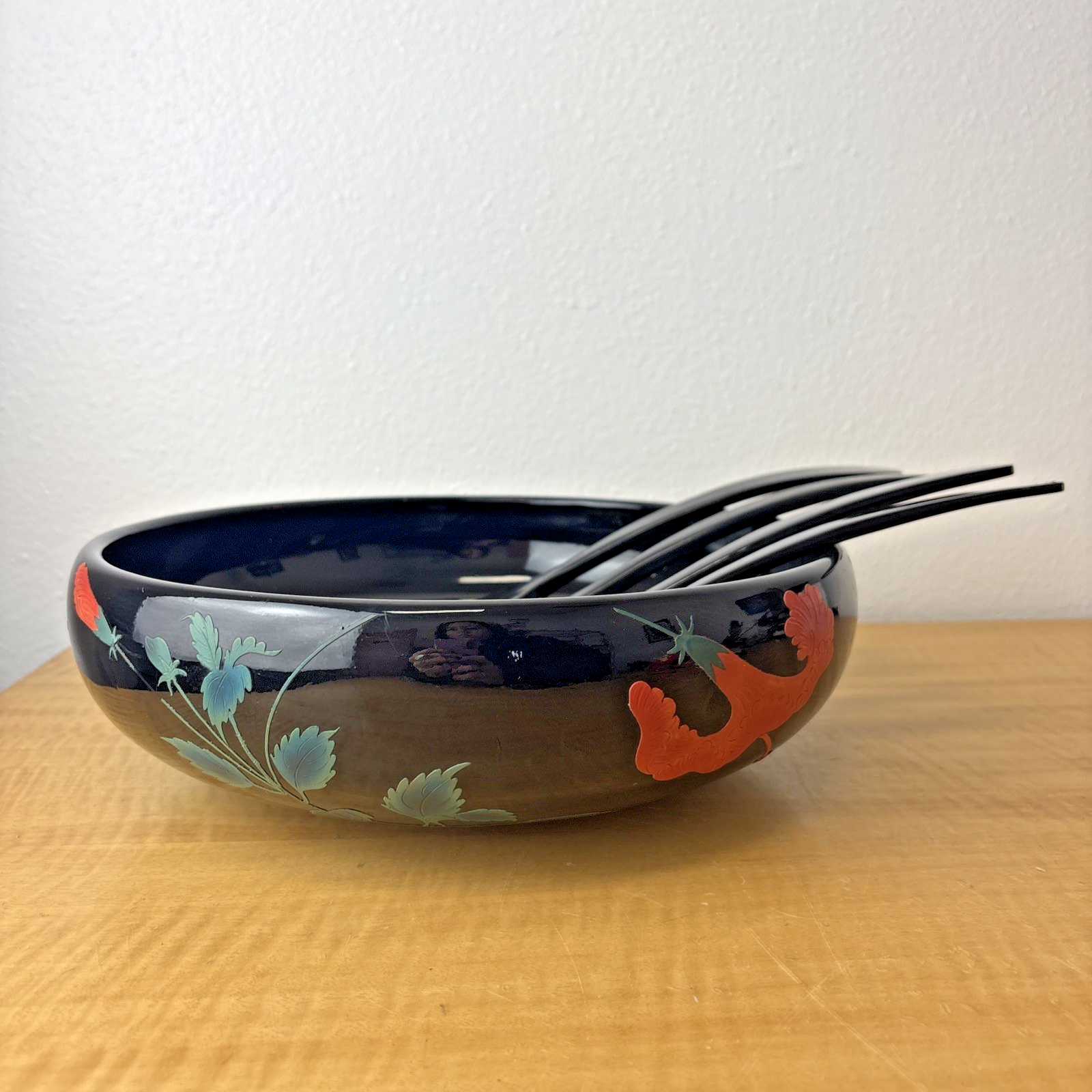 Vintage Bembo Okinawa Lacquerware Hibiscus Serving Bowl and Serving Fork & Spoon