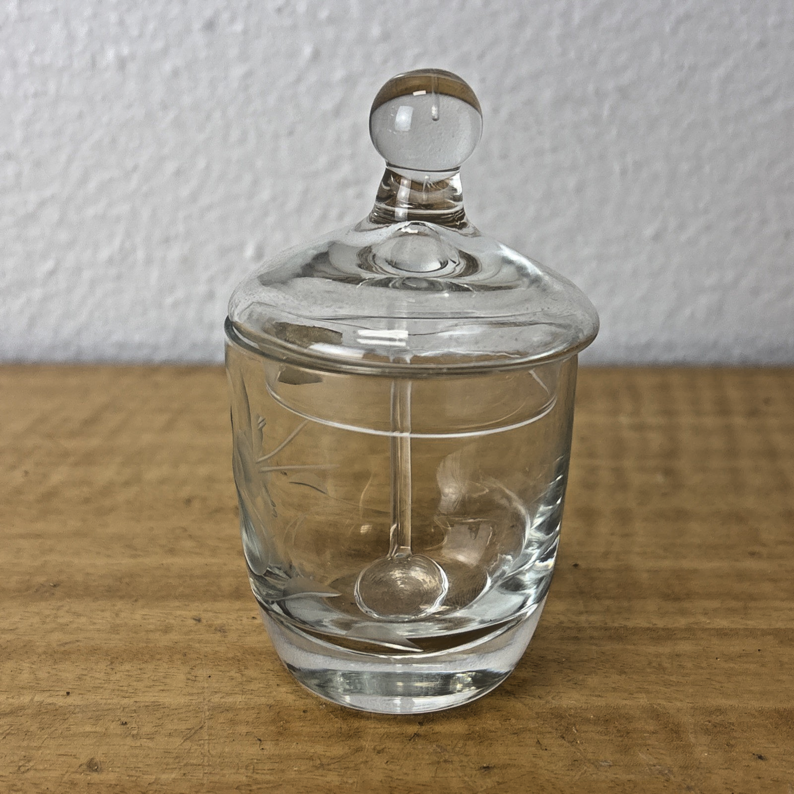 Vintage Hand Cut Glass Jam Jelly Condiment Jar w Spoon Etched Dragonfly