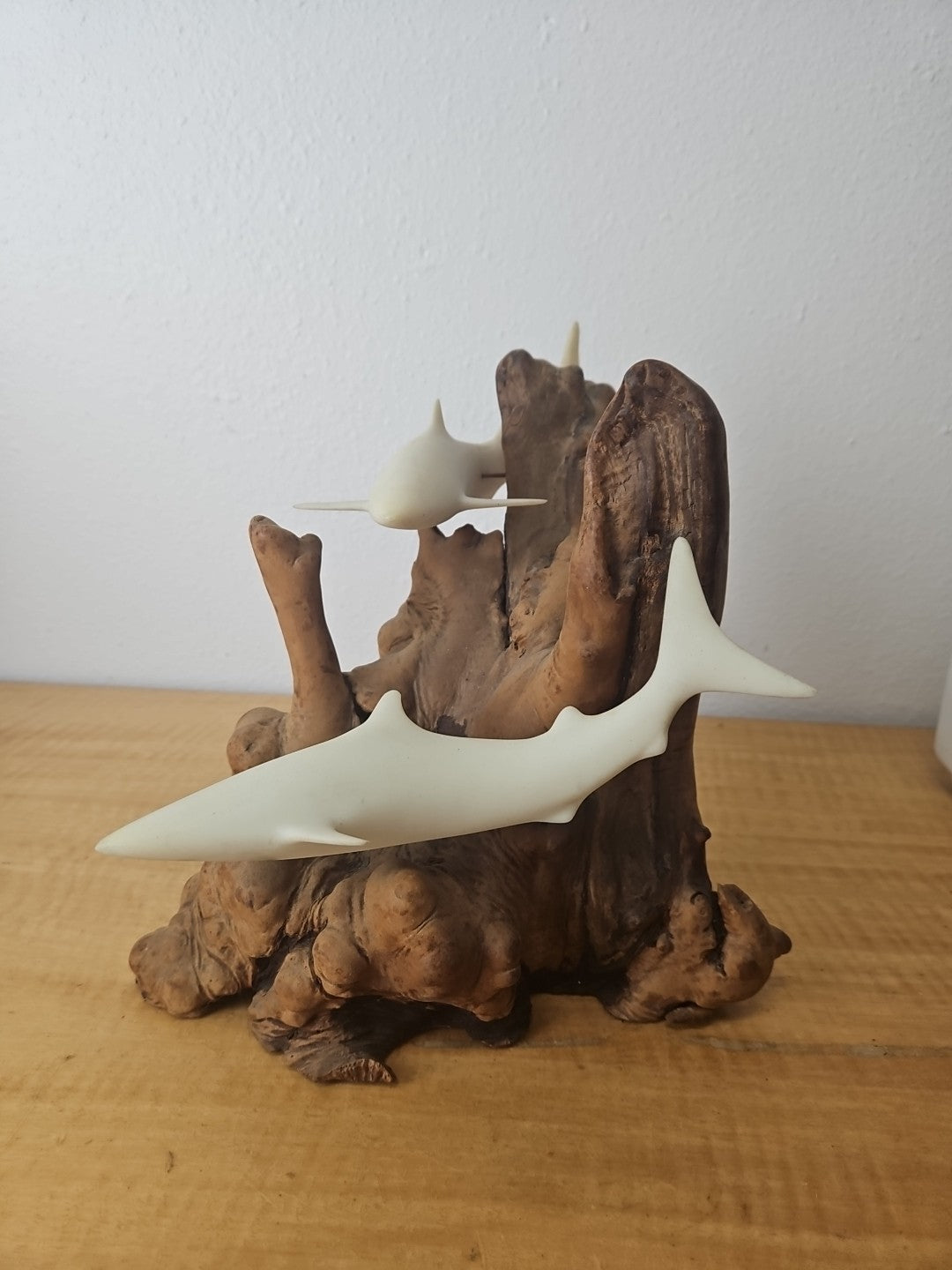 Vintage John Perry Two Shark Sculpture on Burled Wood Base 10x10x10 ’78