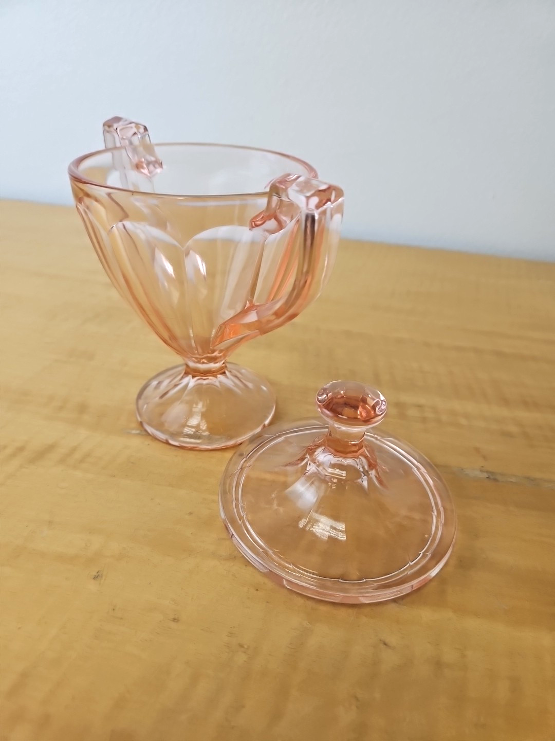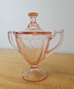 Vintage Pink Depression Glass sugar bowl with lid and handles 6 1/2″