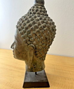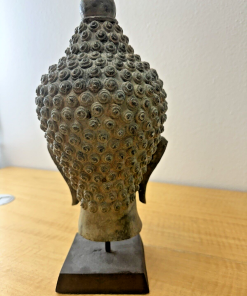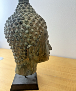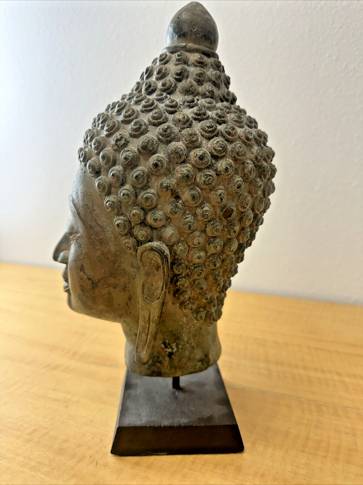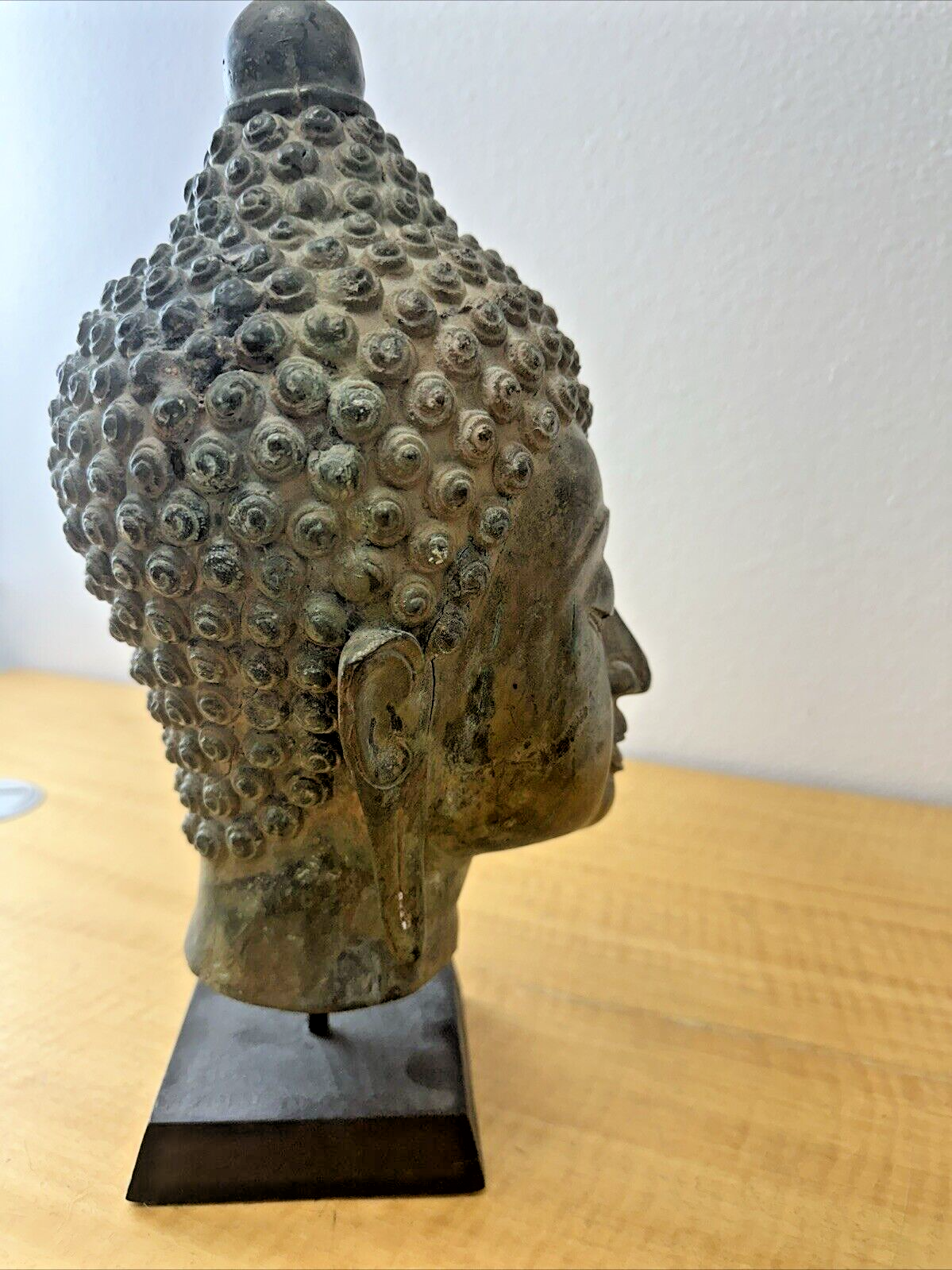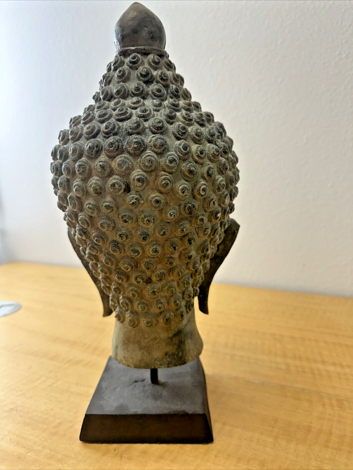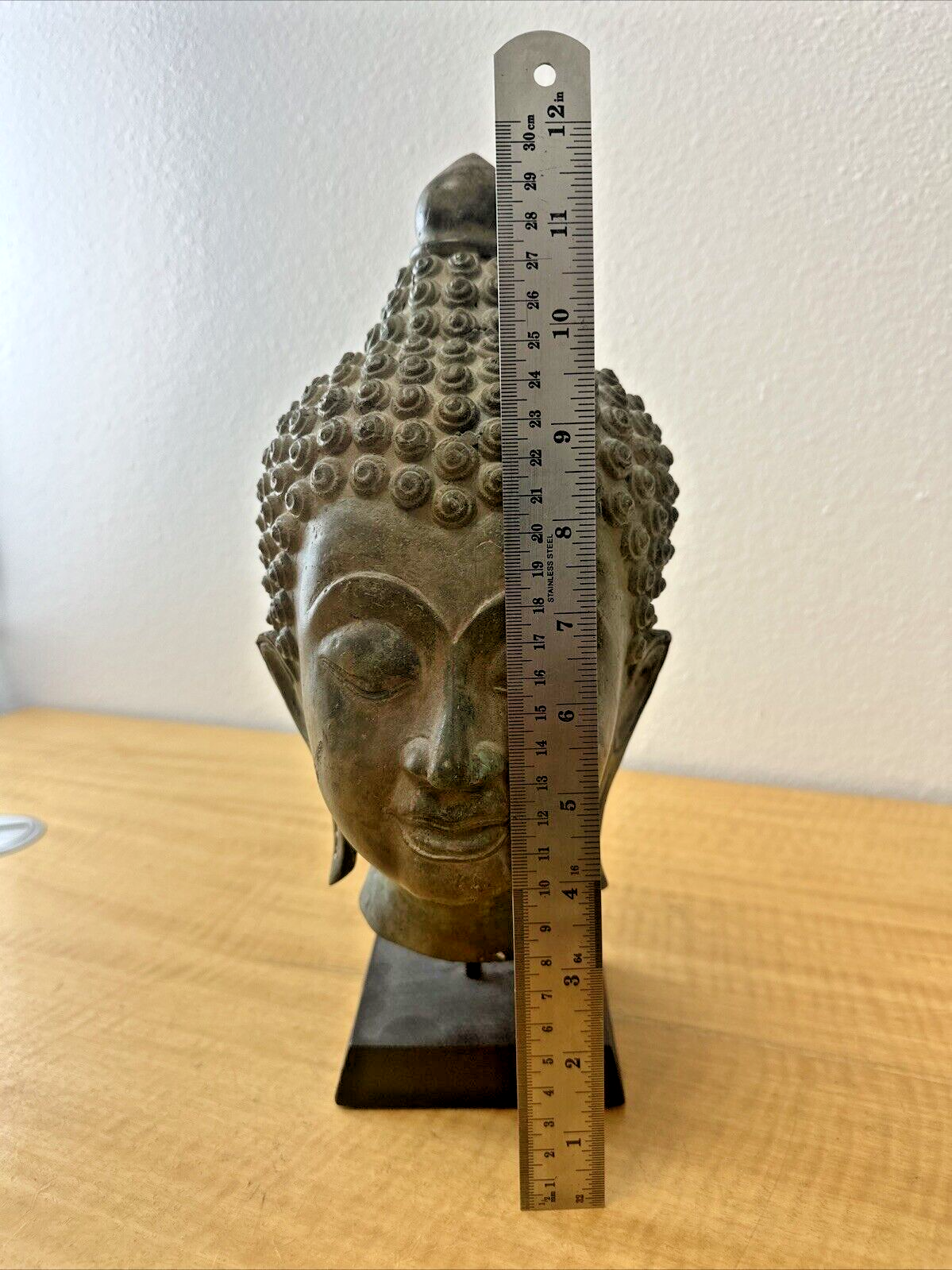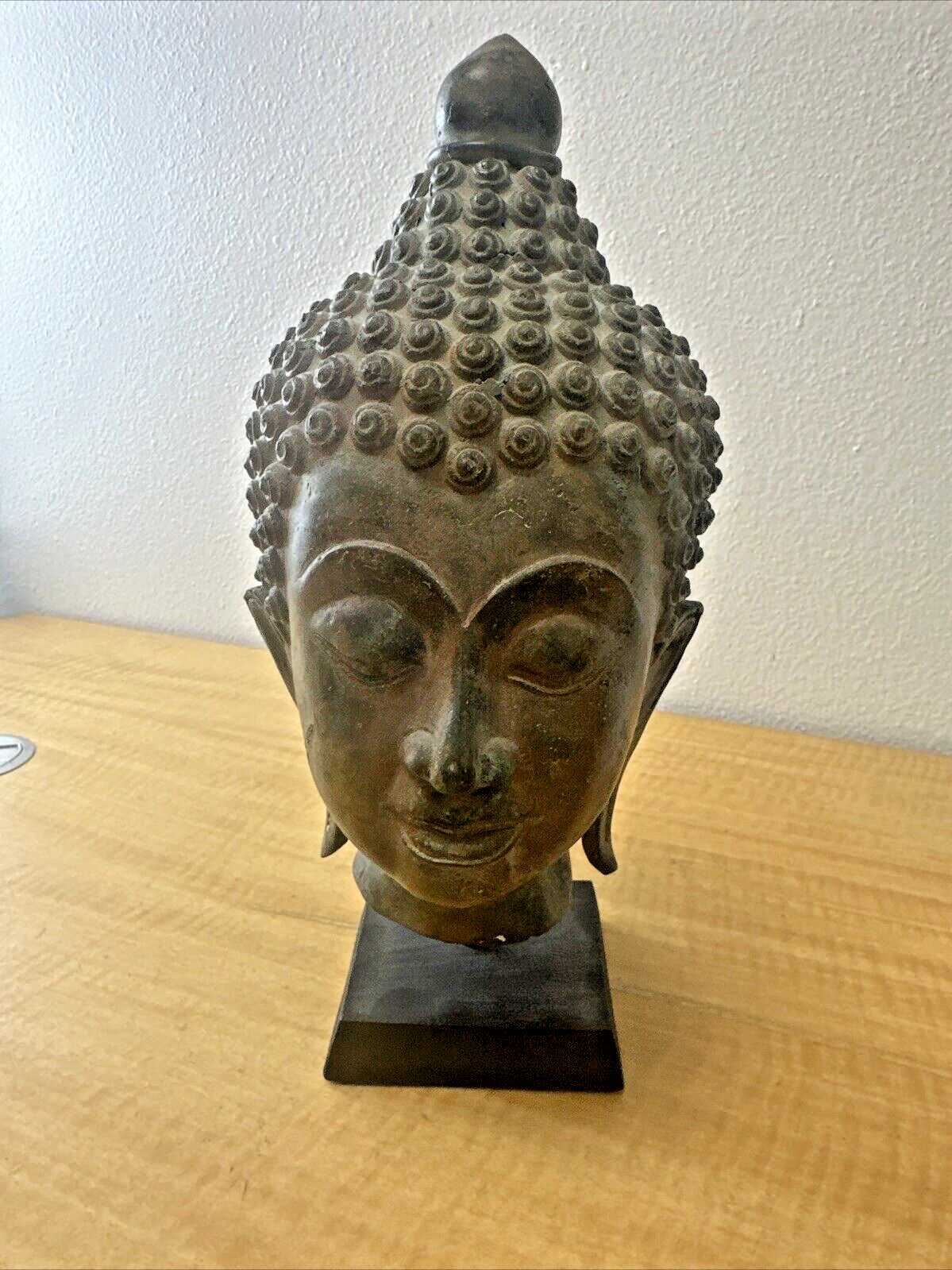 Vintage Southeast Asia Thai Buddha Head Bronze Figure Statue on Wood Base