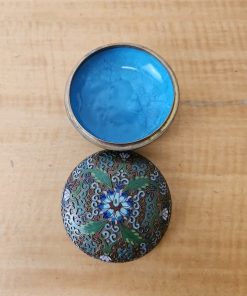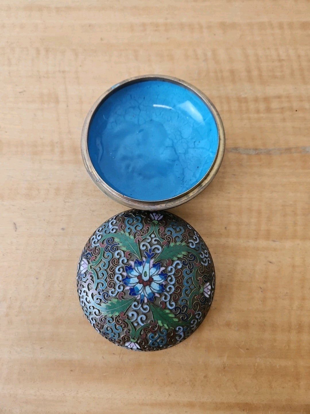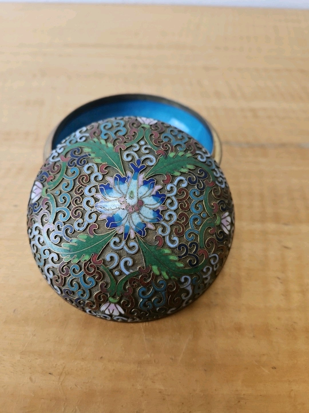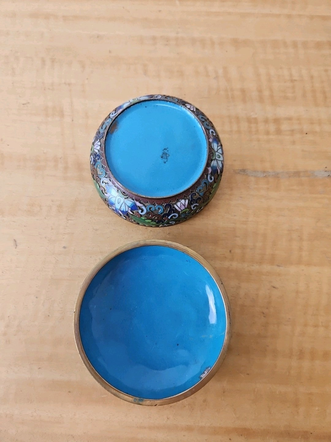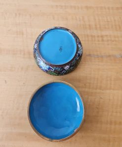 Vintage Trinket box Chinese Cloisonne Champleve blue interior bowl, round