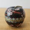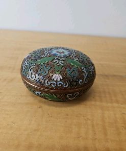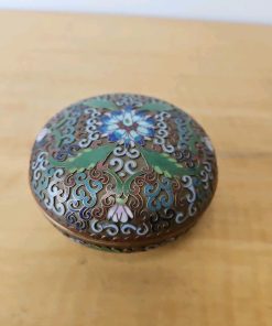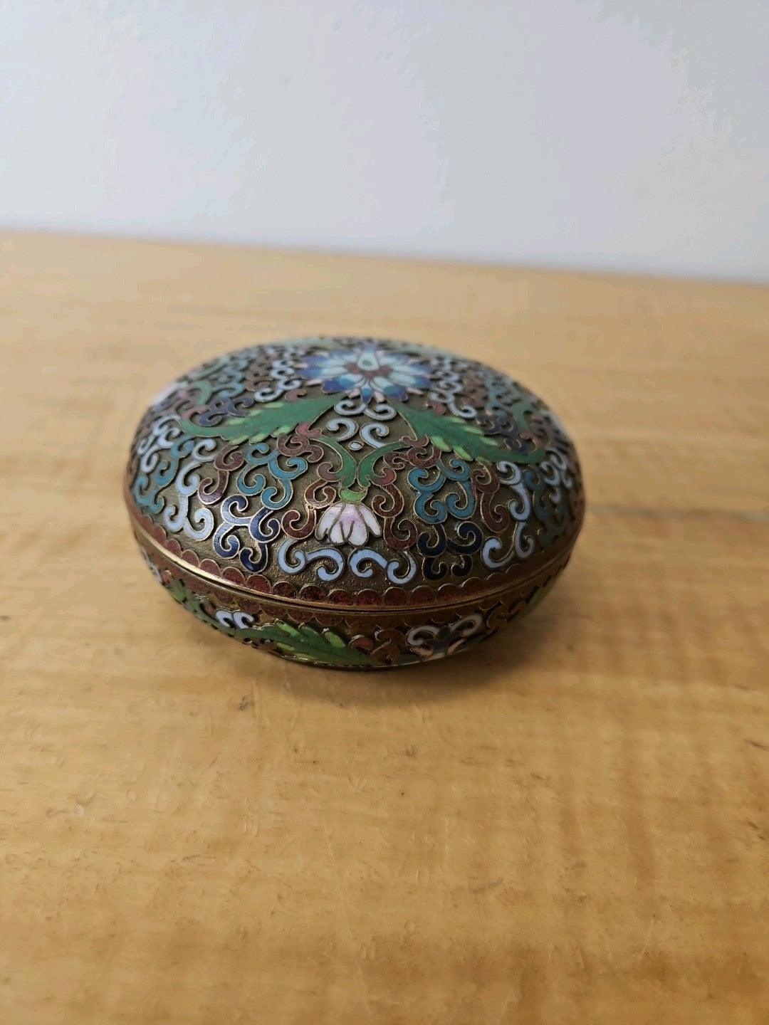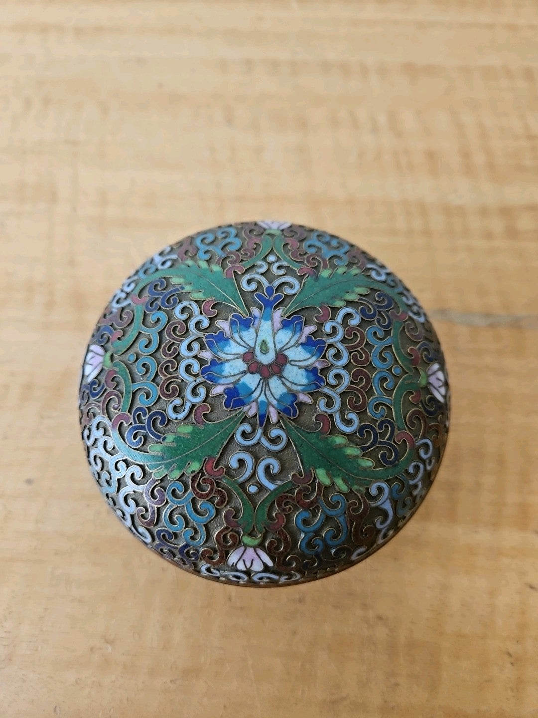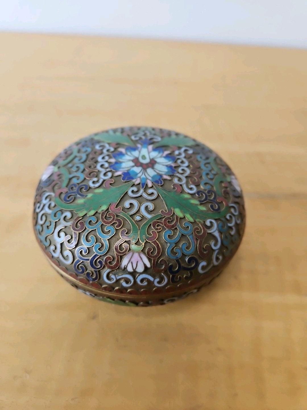 Vintage Trinket box Chinese Cloisonne Champleve blue interior bowl, round