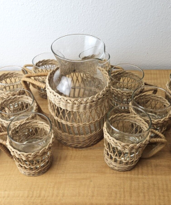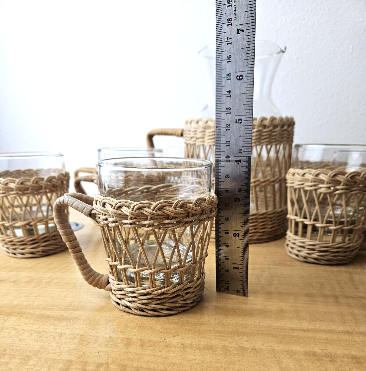 Vintage Woven Rattan Wicker Drinkware Set; pitcher + 11 glasses