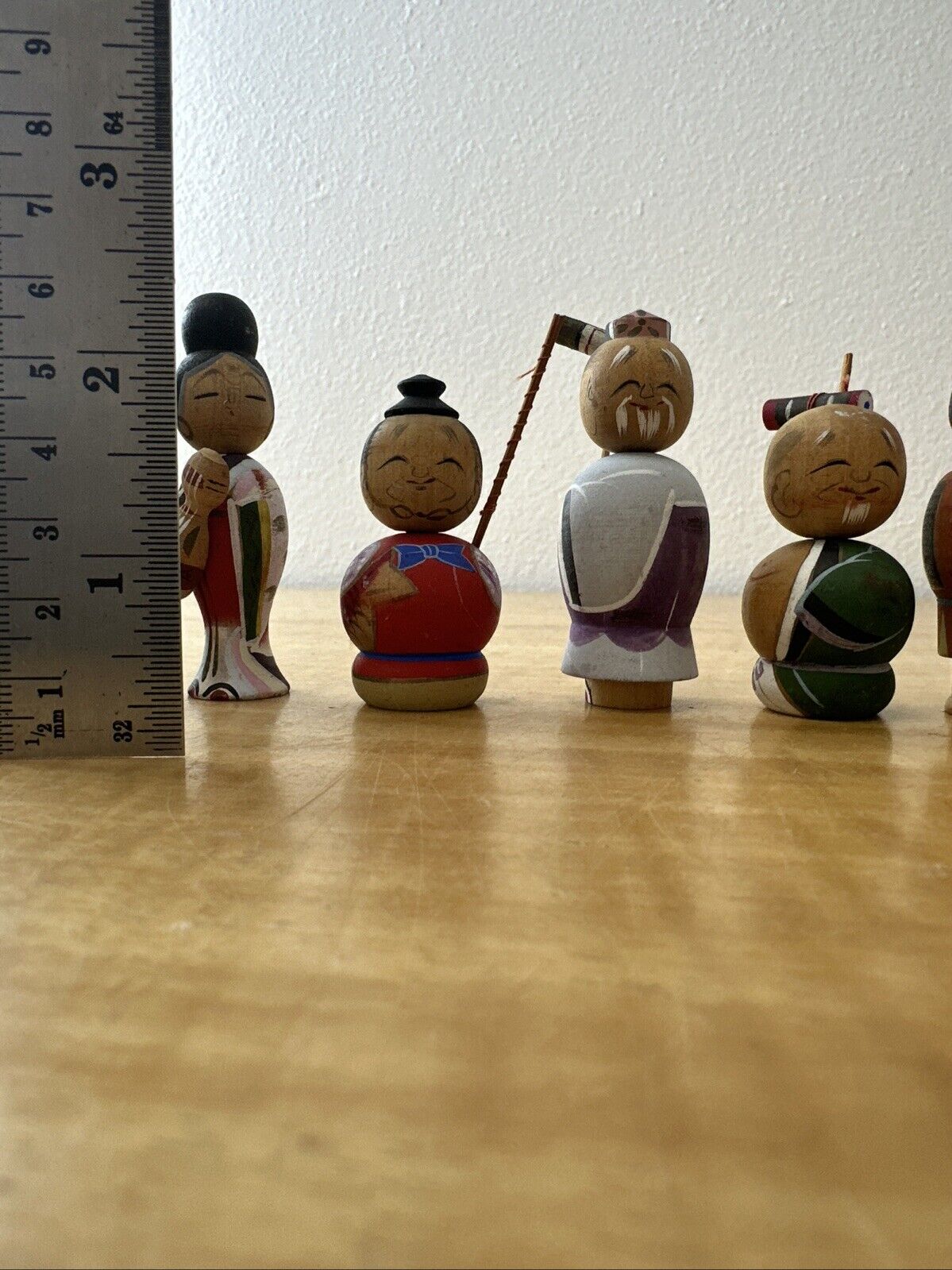 Vtg 7 LUCKY GODS Japanese Hand Painted Kokeshi Wooden Doll Nodders Bobbleheads