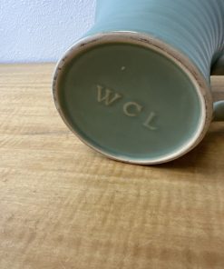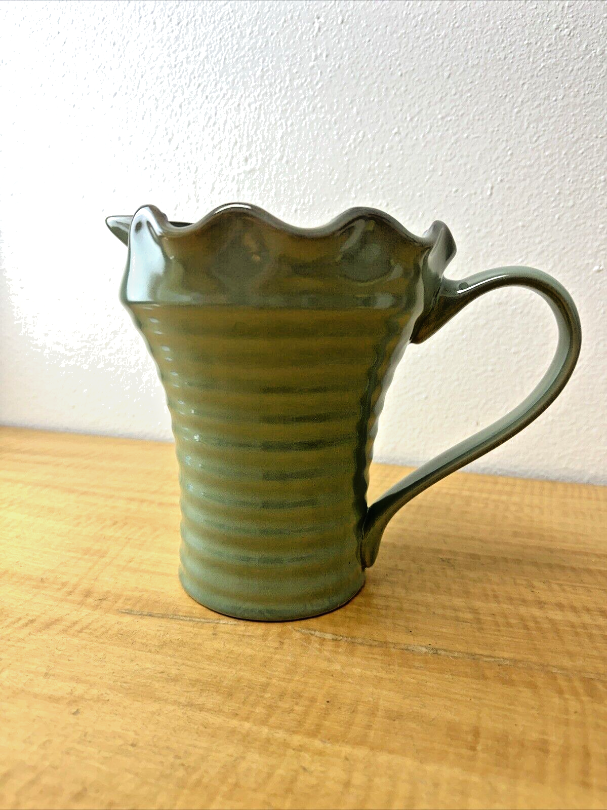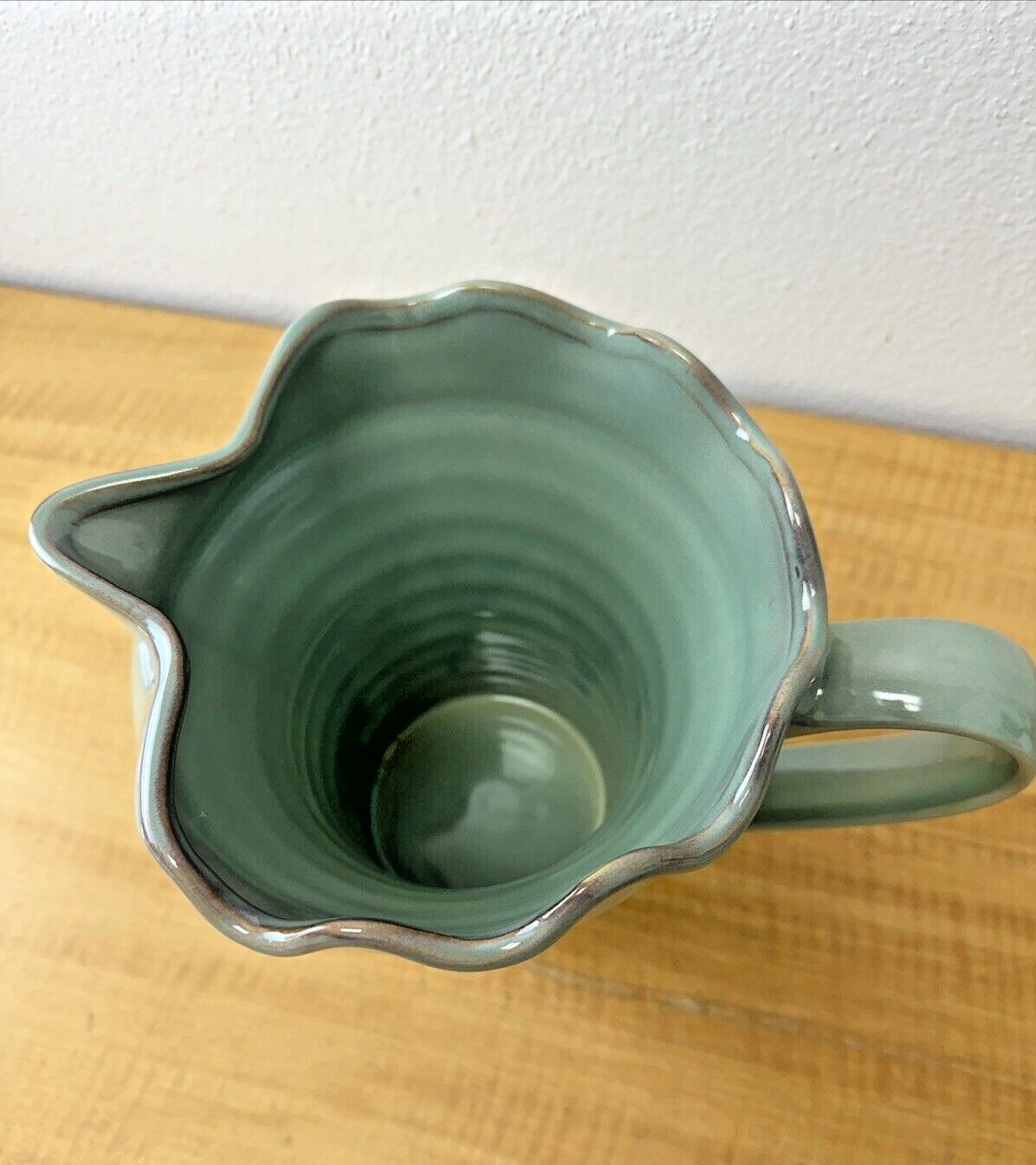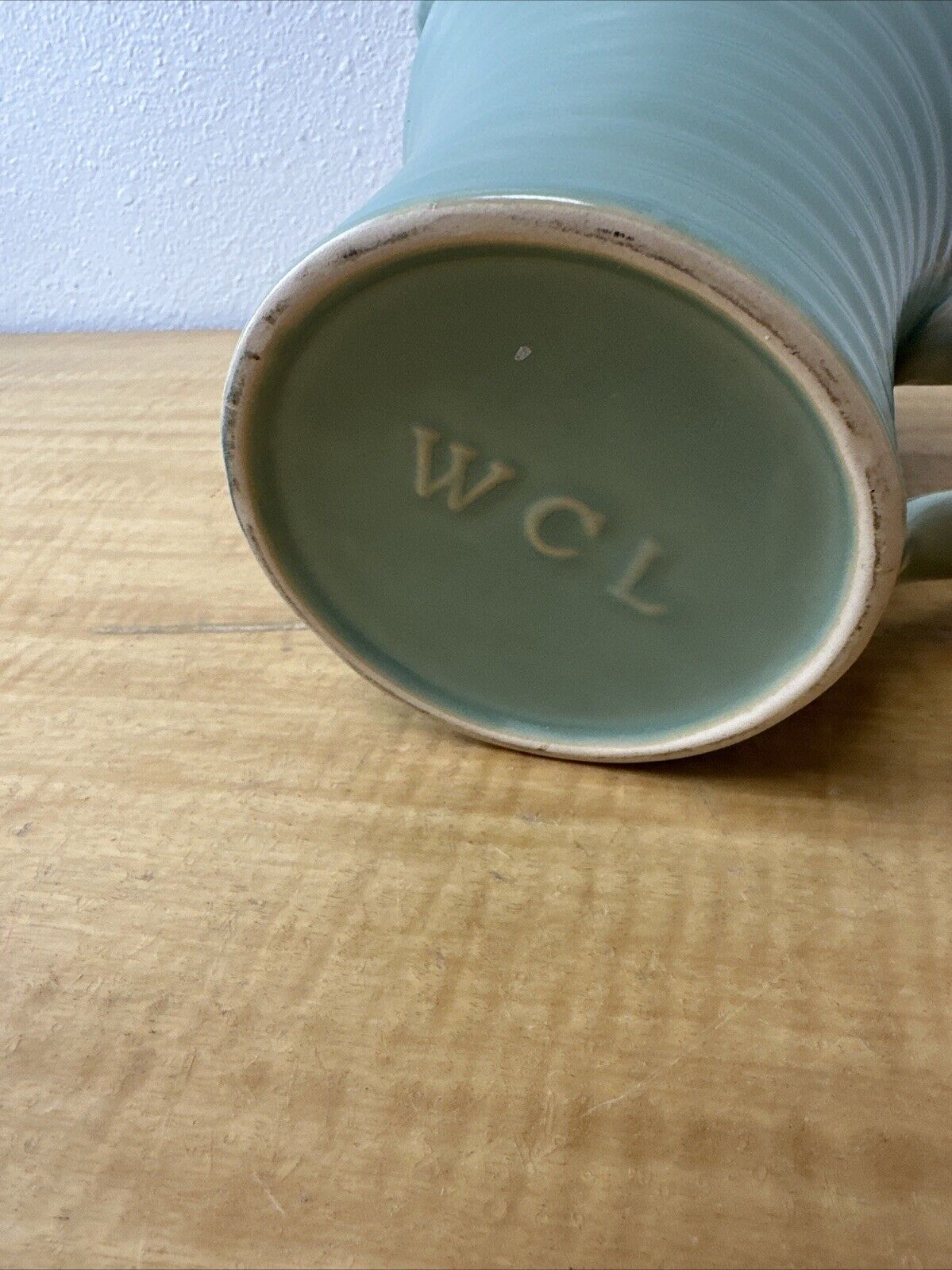 Vtg Blue And Brown 1970s WCL Large Stoneware Pitcher Ribbed & Scallop Top