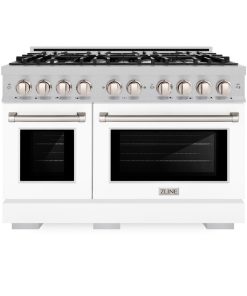 Luxury isn’t meant to be desired – it’s meant to be attainable. The ZLINE 48 in. 6.7 cu. ft. Select Double Oven Gas Range with 8 Burner Cooktop in DuraSnow® Stainless Steel with White Matte Doors (HGRS-WM-48) combines the elegance of a hand-finished porcelain gas cooktop with 8 Italian-made auto-reignition burners, a large gas convection oven with an energy-efficient cooling fan to ensure quiet operation, a small baking oven, and beautiful white matte doors with Horizon window designs allowing you to master every meal. With a modern, timeless style and refined functionality, ZLINE Select Gas Ranges are masterfully crafted to deliver an elevated culinary experience.