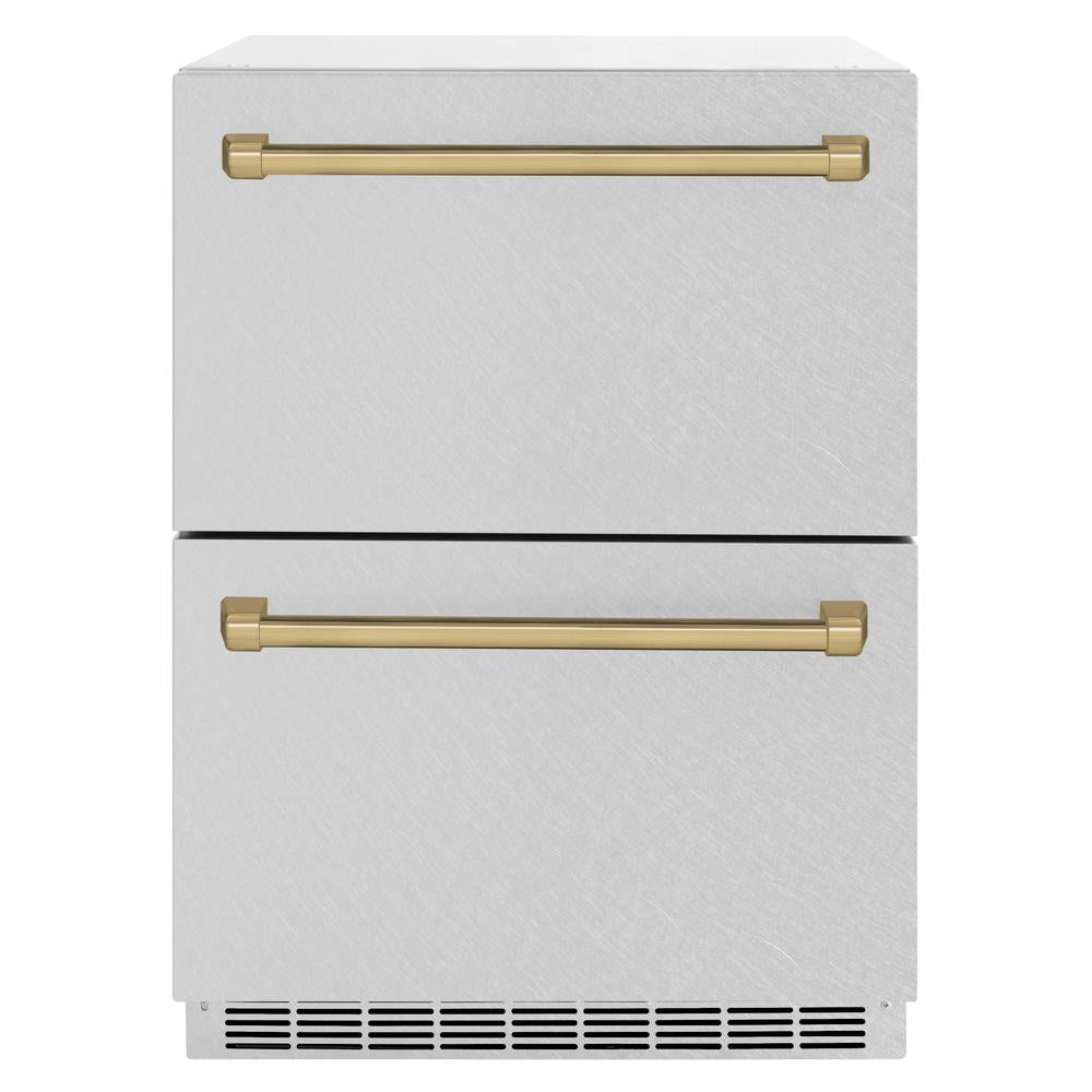 ZLINE Autograph Edition 24 in. Touchstone 168 Can Outdoor-Rated Dual Refrigerator Drawer with DuraSnow Stainless Steel Doors and Champagne Bronze Handles (RDSOZ-SN-24-CB)