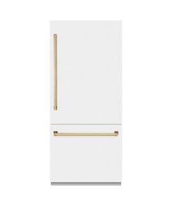 Luxury isn’t meant to be desired – it’s meant to be attainable. The ZLINE Autograph Edition 36 in. 19.8 cu. ft. Built-In Bottom Freezer Refrigerator with Water Dispenser and Ice Maker in White Matte and Polished Gold Accents (RBITZ-WM-36-G) provides the ultimate upgrade to the center of your home by pairing premium dual cooling technology with enhanced storage capacity for multiple grocery items. Achieve ZLINE Attainable Luxury® excellence with innovative features designed to enhance your kitchen’s cooling and freezing capability.