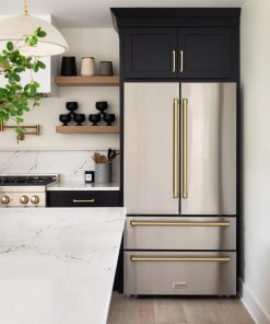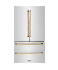 ZLINE Autograph Edition 36 in. 22.5 cu. ft. Counter-Depth French Door Refrigerator with Ice Maker in Fingerprint-Resistant Stainless Steel with Polished Gold Traditional Handles (RFMZ-36-G)