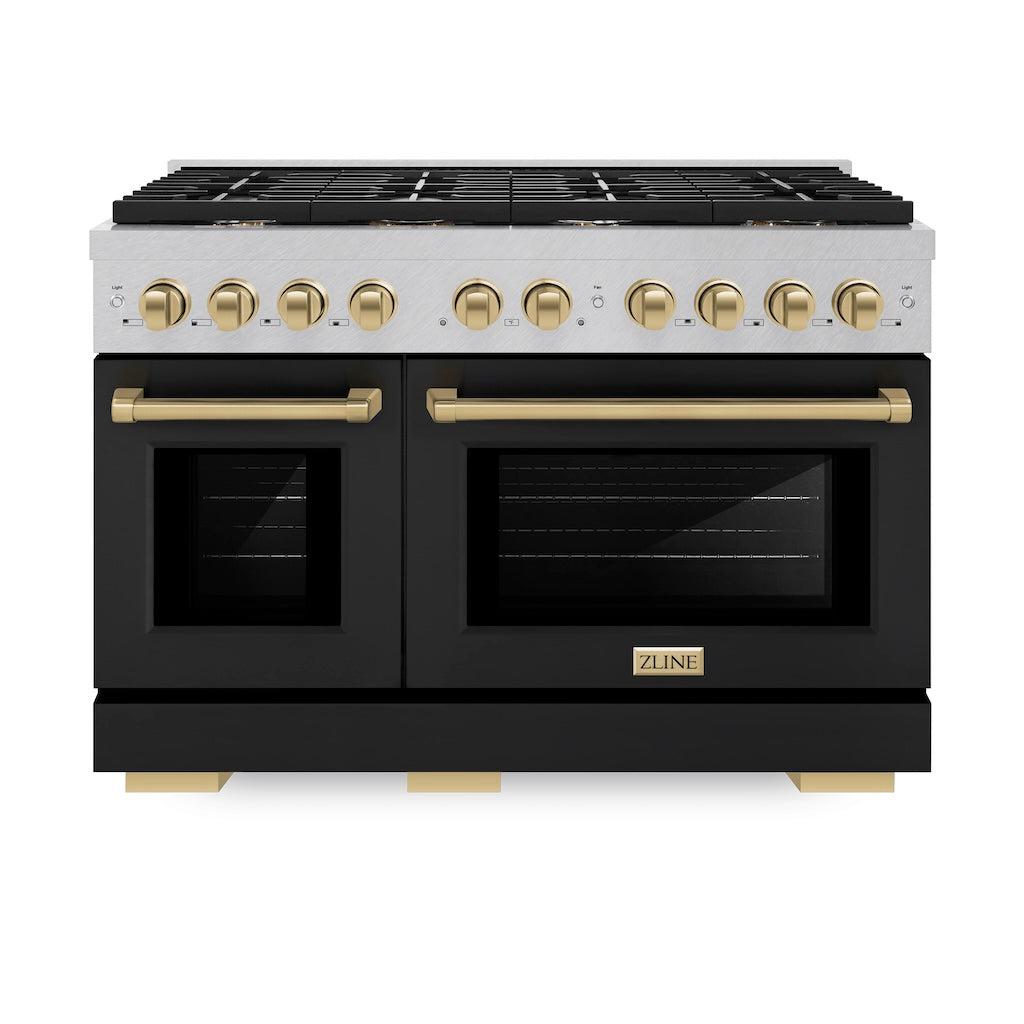 ZLINE Autograph Edition 48 in. 6.7 cu. ft. Paramount Double Oven Gas Range with 8 Burner Cooktop in DuraSnow Stainless Steel with Black Matte Doors and Champagne Bronze Accents (SGRSZ-BLM-48-CB)