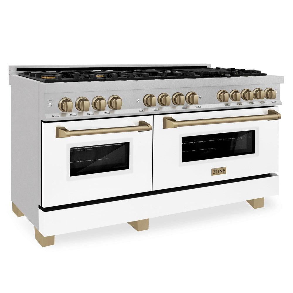 ZLINE Autograph Edition 60 in. 7.4 cu. ft. Legacy Dual Fuel Range with 9 Burner Gas Cooktop and 2 Electric Convection Ovens in DuraSnow Stainless Steel with White Matte Doors and Champagne Bronze Accents (RASZ-WM-60-CB)