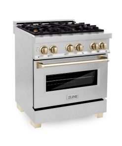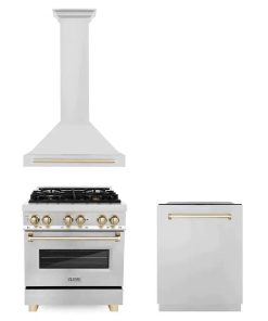 ZLINE Autograph Edition Kitchen Package in Stainless Steel with 30 in. Dual Fuel Range, 30 in. Range Hood, and 24 in. Dishwasher with Polished Gold Accents (3AKP-RARHDWM30-G)