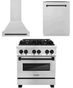 ZLINE Autograph Edition Kitchen Package with Stainless Steel 30 in. Dual Fuel Range, 30 in. Range Hood, and 24 in. Dishwasher with Matte Black Accents (3AKP-RARHDWM30-MB)
