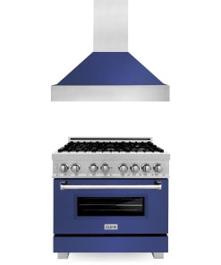 ZLINE 36 in. Kitchen Package with DuraSnow Stainless Steel Dual Fuel Range with Blue Matte Door and Convertible Vent Range Hood (2KP-RASBMRH36)