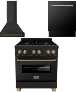 ZLINE Autograph Edition 30 in. Kitchen Package with Black Stainless Steel Dual Fuel Range, Range Hood and Dishwasher with Champagne Bronze Accents (3AKP-RABRHDWV30-CB)