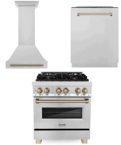 ZLINE Autograph Edition 30 in. Kitchen Package with Black Stainless Steel Dual Fuel Range, Range Hood and Dishwasher with Polished Gold Accents (3AKP-RABRHDWV30-G)