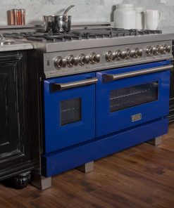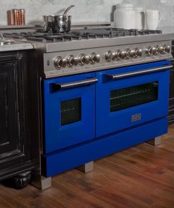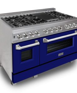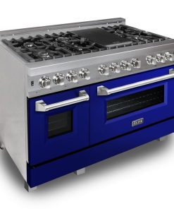 ZLINE 48 in. 6.0 cu. ft. Legacy Dual Fuel Range with 7 Burner Gas Cooktop and 2 Electric Ovens in DuraSnow Stainless Steel and Blue Matte Doors (RAS-BM-48)