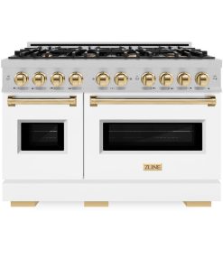 ZLINE Autograph Edition 48 in. 6.7 cu. ft. Classic Double Oven Dual Fuel Range with 8 Burner Gas Cooktop in DuraSnow Stainless Steel with White Matte Doors and Polished Gold Accents (CDRSZ-WM-48-G)