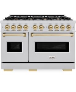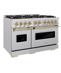 ZLINE Autograph Edition 48 in. 6.7 cu. ft. Classic Double Oven Dual Fuel Range with 8 Burner Gas Cooktop in DuraSnow Stainless Steel and Polished Gold Accents (CDRSZ-48-G)