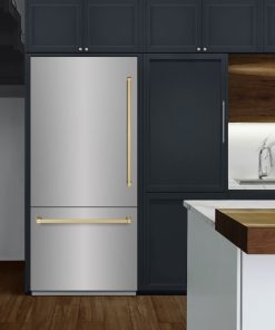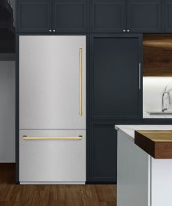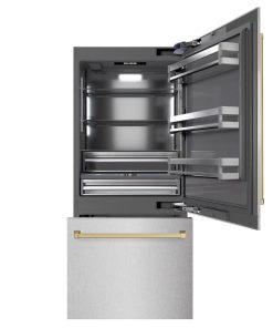 ZLINE Autograph Edition 36 in. 19.8 cu. ft. Built-In Bottom Freezer Refrigerator with Water Dispenser and Ice Maker in Stainless Steel with Graphite Gray Interior and Polished Gold Accents (GRBITZ-304-36G)