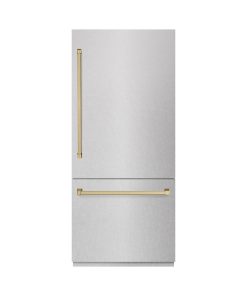 ZLINE Autograph Edition 36 in. 19.8 cu. ft. Built-In Bottom Freezer Refrigerator with Water Dispenser and Ice Maker in DuraSnow Stainless Steel and Polished Gold Accents (RBITZ-SN-36-G)