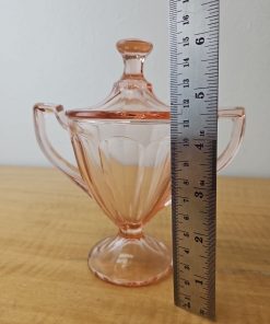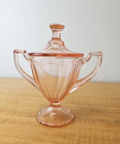 Vintage Pink Depression Glass sugar bowl with lid and handles 6 1/2″