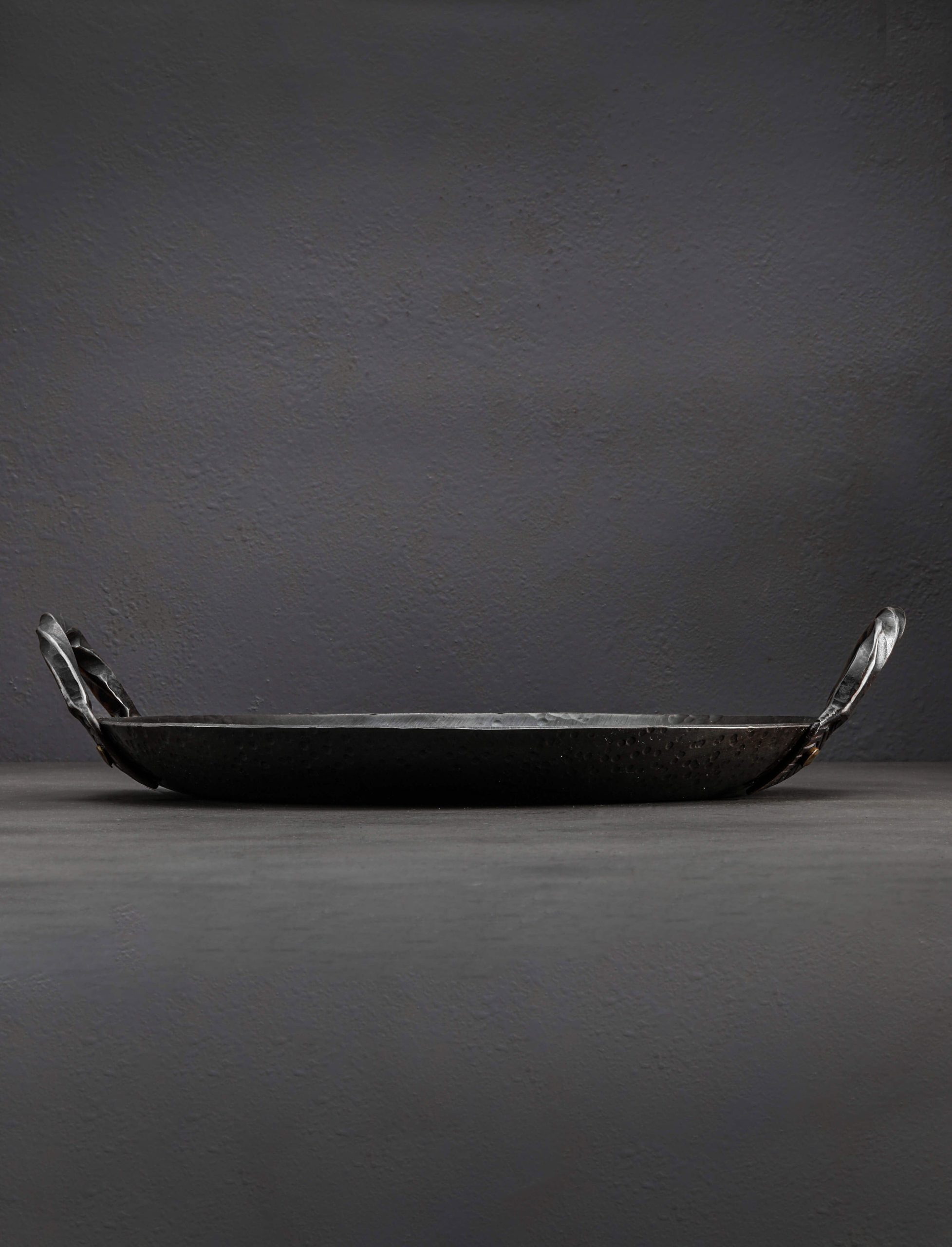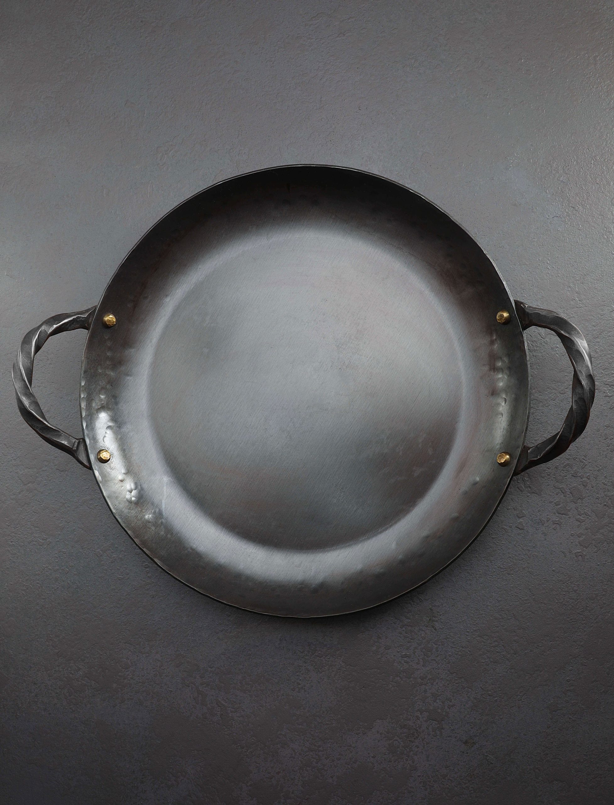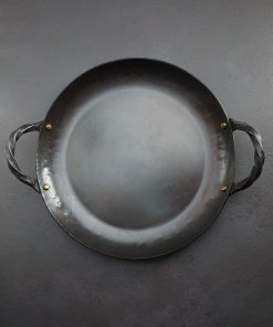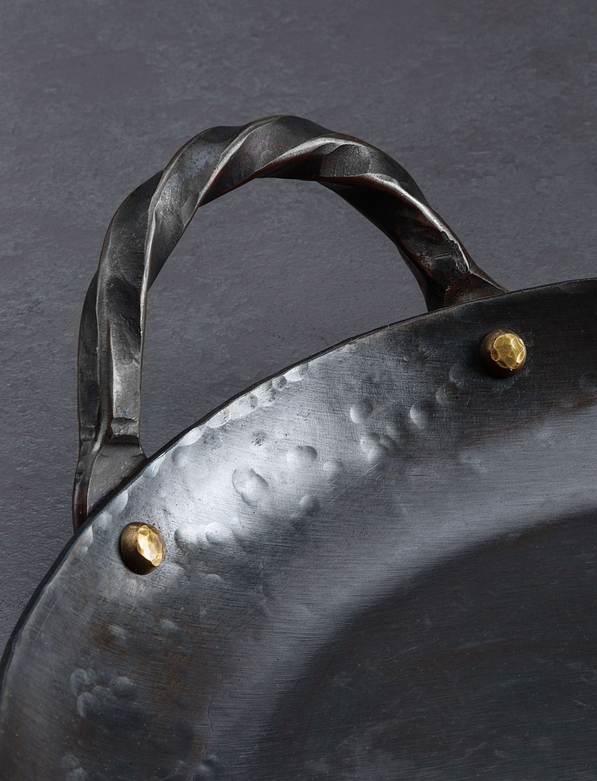 At 13″ across with a pair of decoratively hand-forged loop handles in stainless steel, this carbon roasting pan is ready for even the largest of feasts. Handmade in Oregon by Ryan Sanden of State Coach Farm Forge, the versatility and performance of solid carbon steel and its non-stick properties make this pan ideal for use in the kitchen, on the stove, in the oven, or outside over the open flame. A hammered exterior and solid, oversized, peened brass rivets complete this beautiful cooking tool.